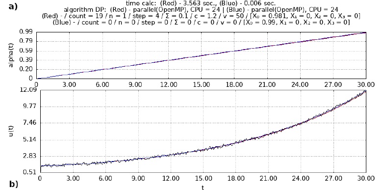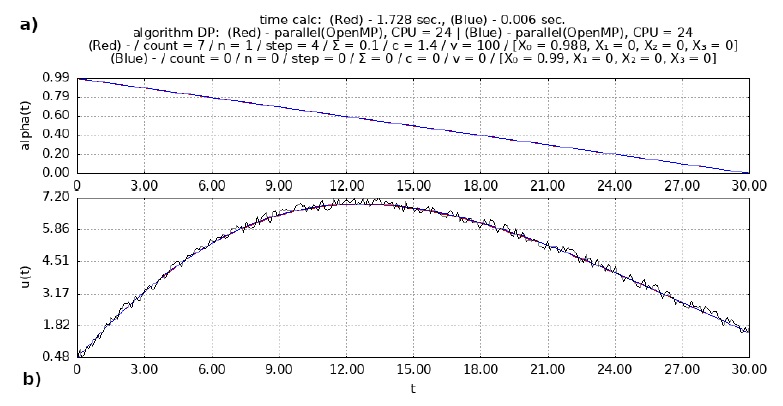 [Figure 1. Example 1. is a linear-increasing. a) Graphs : (Blue) – reference , (Red) – restored ; b) Model curves: (Blue) – reference, (Red) – optimization result at , ]