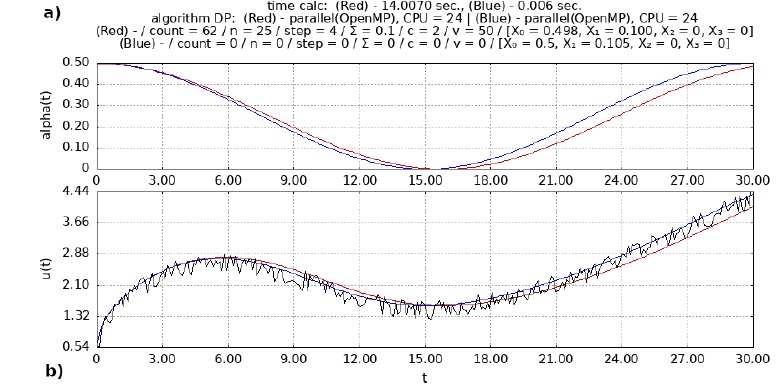 [Figure 3. Example 3. – periodic function. a) Graphs : (Blue) – reference , (Red) – restored ; b) Model curves: (Blue) – reference, (Red) – result optimization at , ]