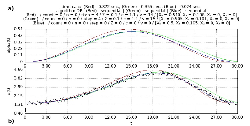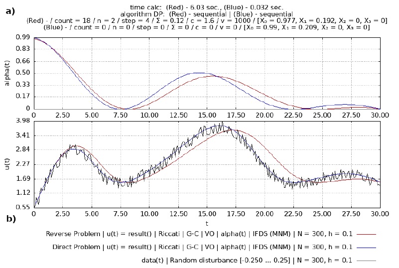 [Figure 4. Example 4. – periodic. a) Graphs : (Blue) – reference , (Red, Green) – restored ; b) Model curves: (Blue) – reference, (Red, Green) – results optimization at , ]