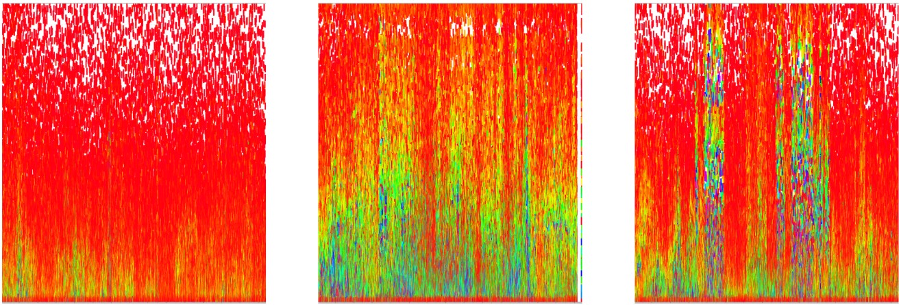 Первый этап методики предусматривает подготовку данных и начинается с применения структурно-лингвистической обработки временных файлов, содержащих сигналы ГАЭ, которые были получены в ходе наблюдений на Камчатском геодинамическом полигоне в рамках выполнения государственного задания ИКИР ДВО РАН с 2016 по 2021 годы [22]. Каждый файл это отрезок сигнала, представленный 15 минутным его фрагментом. Длительность фрагмента принята в лаборатории акустических исследований ИКИР ДВО РАН за условный стандарт — минимально достаточный блок для обработки данных выбранными методами. Файл содержит от нескольких десятков до нескольких тысяч импульсов ГАЭ. В результате структурно-лингвистической обработки из каждого файла выделяется алфавит. После сортировки по значениям размерности элементов каждый алфавит представляется как вектор. Далее составляется ряд векторов, полученных из последовательно следующих друг за другом фрагментов сигнала. В памяти компьютера формируется блок размерностью 512 на 2880 точек, который визуально может быть представлен трехмерным графиком, составленным из 2880 векторов. Пример трех сформированных отображений представлен на рис. 1.