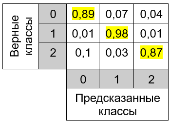 Нейросеть верно распознала 89% отображений в Классе 0, 98% отображений в Классе 1 и 87% отображений в Классе 2. Таким образом средняя точность распознавания составила 91 %. Графики обучения модели на рис. 4 и 5 показывают ровную тенденцию без всплесков переобучения.
