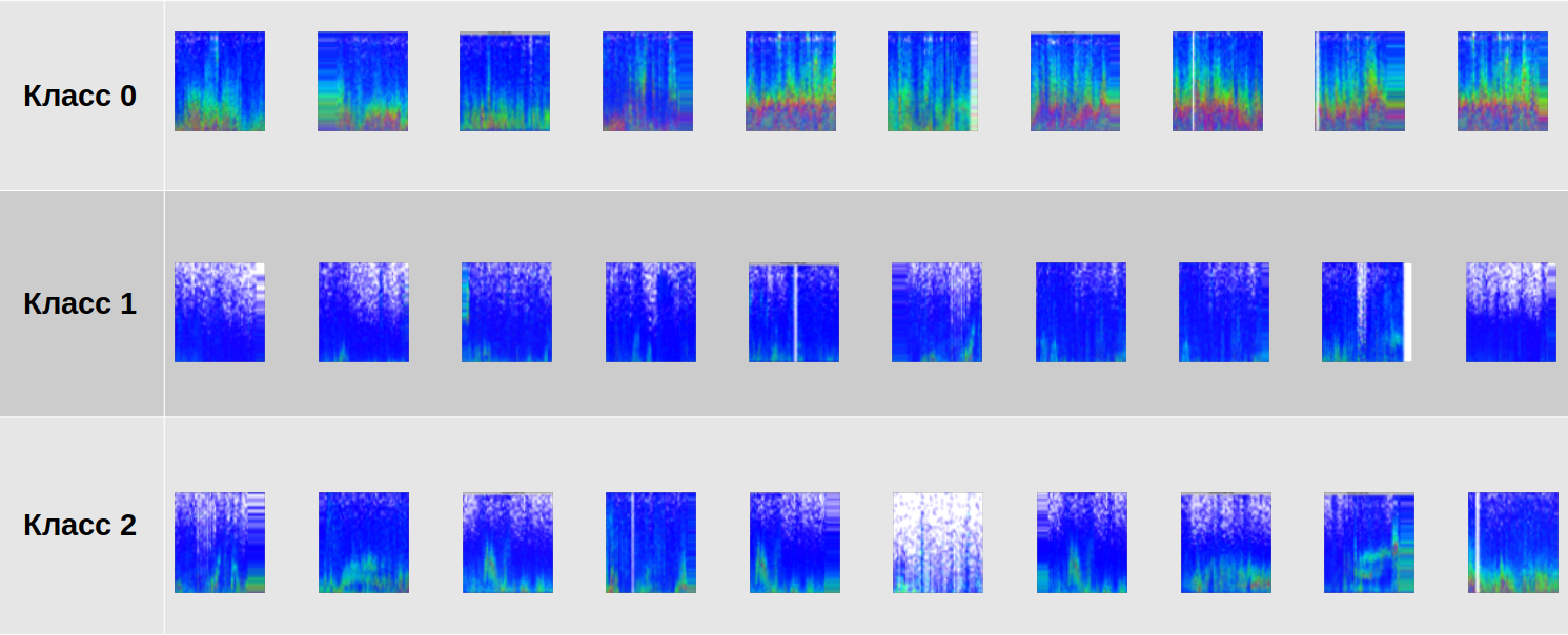 На рис. 6 представлены ряды по 10 экземпляров отображений, представляющих определенный класс. Можно видеть достаточно заметные отличия паттернов отображений для каждого из классов. Однако сделать убедительные выводы по состоянию поверхностного слоя литосферы на основании только наблюдаемой динамики характеристик сигнала ГАЭ по паттернам отображений и времени проявления паттернов оказалось недостаточно. Здесь в явном виде помимо нелинейности самих сейсмических явлений, формирующих специфические паттерны на отображениях, значительно влияют погодные и сезонные природные влияния в виде осадков, температурных градиентов и перепадов атмосферного давления, которые были ранее зафиксированы в наших исследованиях (например, [24]).