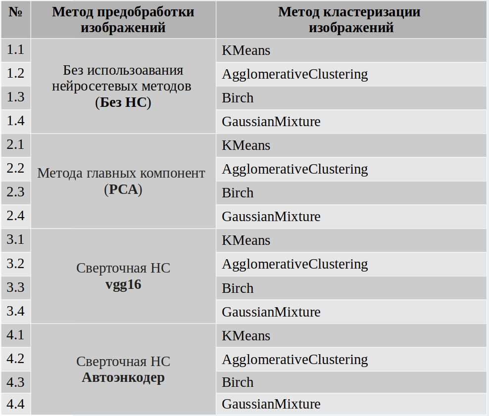 Методика проведения экспериментов по комбинированию методов препроцессинга данных с методами кластеризации картин