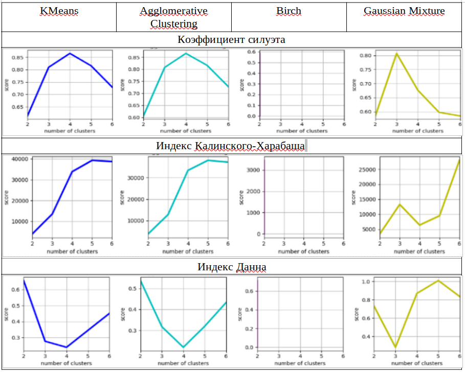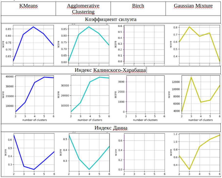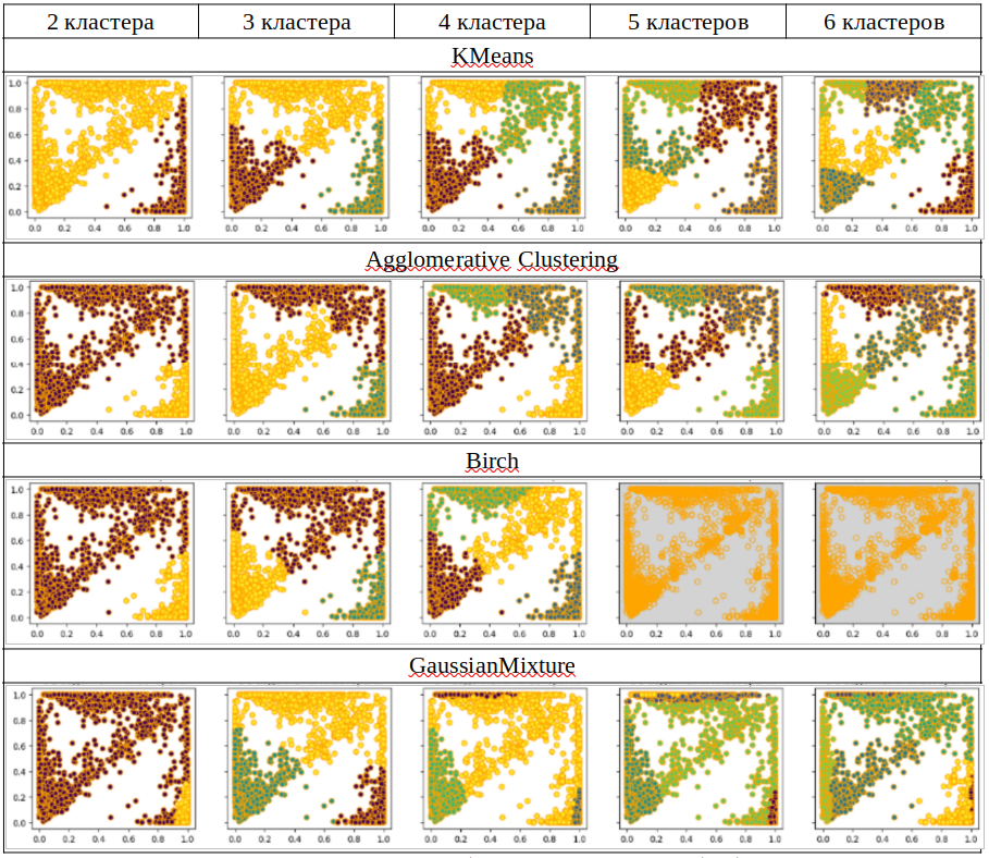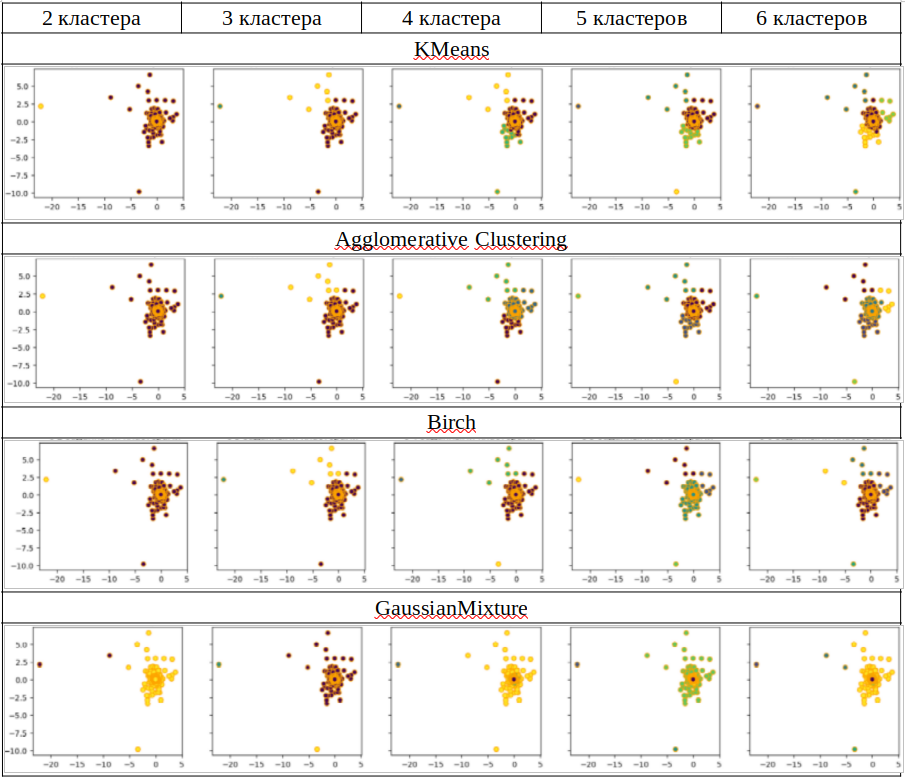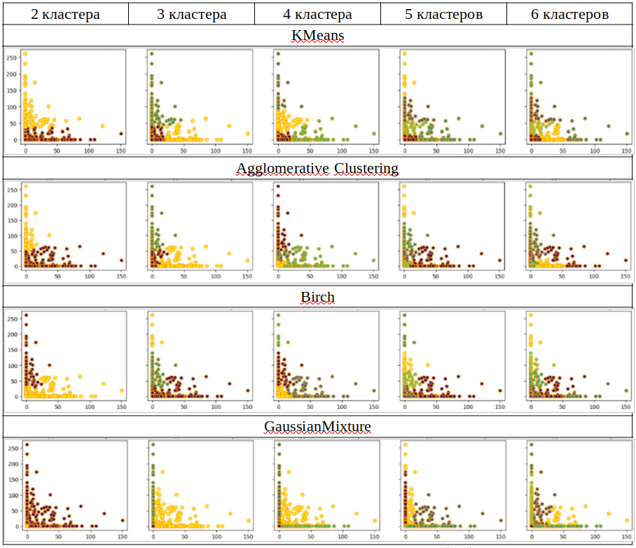 - ’GaussianMixture’ (модель гауссовой смеси, GMM) - GMM использует подход суждения о том, что вероятность, которая определяет окончательную категорию атрибуции, вычисляется через вероятность принадлежности к определённой категории. В качестве метрики близости объектов принимается вероятностная мера в отличие от предшествующих, где мера по умолчанию принята евклидовой.