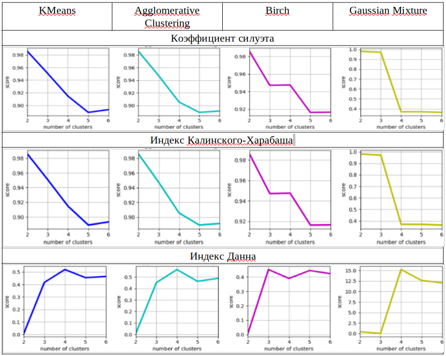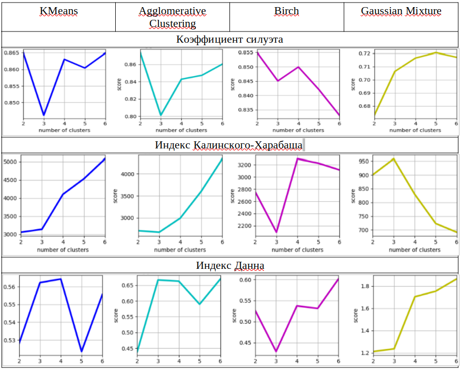 Для понимания получаемых результатов и возможности их корректного объективного сравнения необходимо было выбрать метрики оценки качества и достоверности алгоритмов кластеризации, которые наиболее подходили бы для работы с конкретным набором данных. Практика многочисленных исследований с применением кластеризации доказывает, что выбор определенной метрики зависит от конкретной задачи и особенностей данных. В некоторых случаях может оказаться эффективным использование метрик, основанных на измерении расстояний до центроидов или плоскостей, а также метрик, учитывающих структуру данных [17]. Таким образом, задача выбора и оптимизации метрик расстояний является открытой и активно исследуется в научных исследованиях. В данном исследовании использование различных метрик оценки качества выбранных методов предобработки и кластеризации позволило лучшим образом настраивать глобальные параметры рабочих алгоритмов НС. Для проведения экспериментов были выбраны следующие метрики оценки: