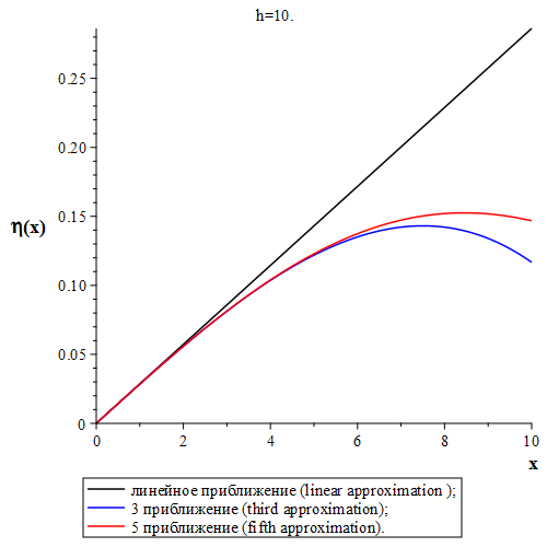 На рис. 3 представлены графики зависимости профиля гравитационных волн (13), формирующихся на свободной поверхности, за источником возмущения; профиль волны представим в виде многочлена Тейлора до пятого порядка по параметру . Глубину погружения волнового источника считаем фиксированной и равной .