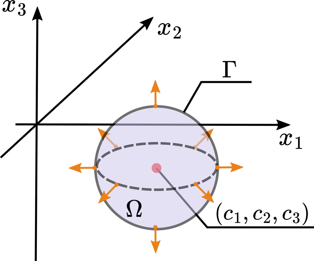Рис. 1. Сферическое включение Ω, ограниченное поверхностью Γ с центром в точке (c1,c2,c3), на которой заданы простые силы интенсивности P (🡪) по направлению внешней нормали.