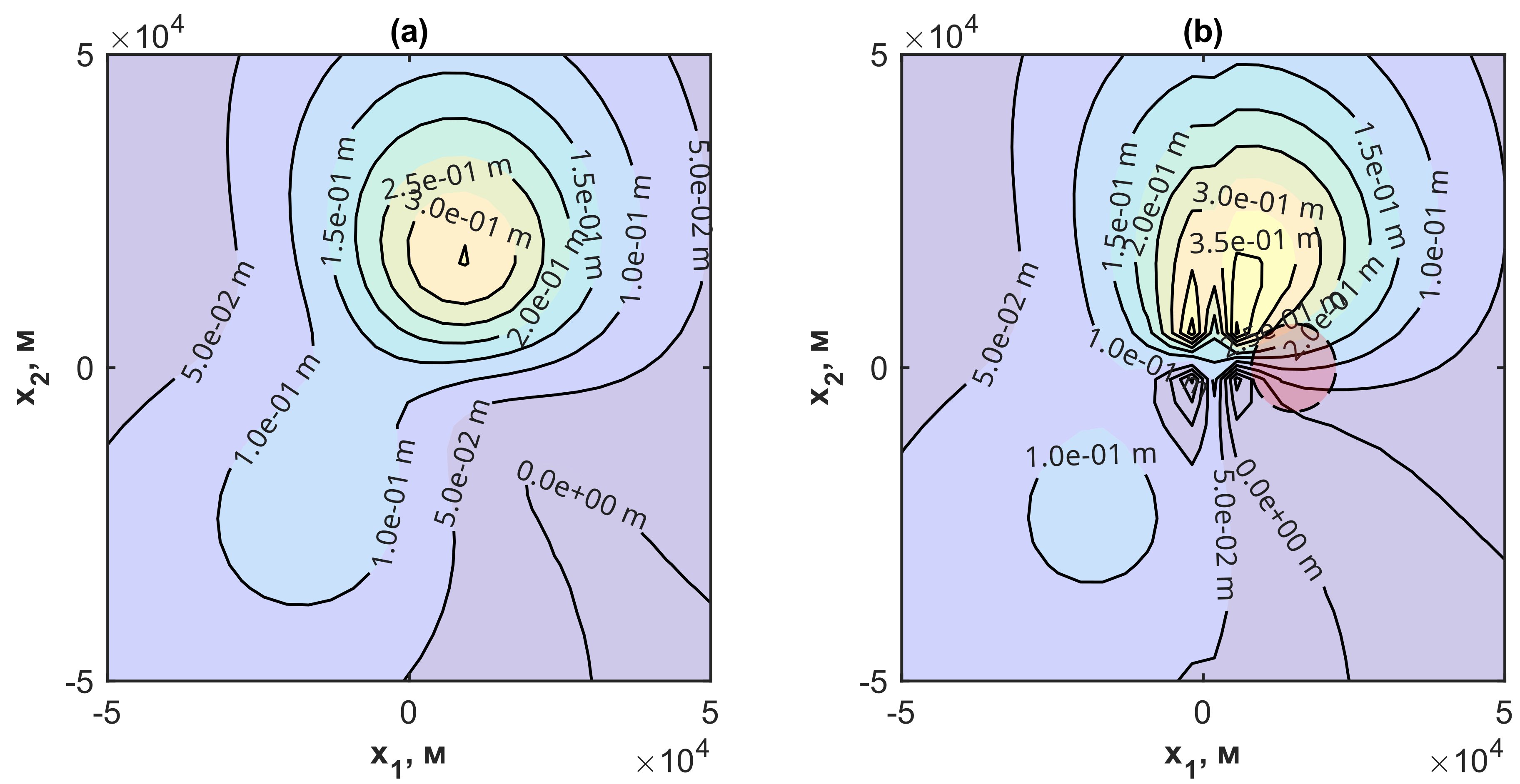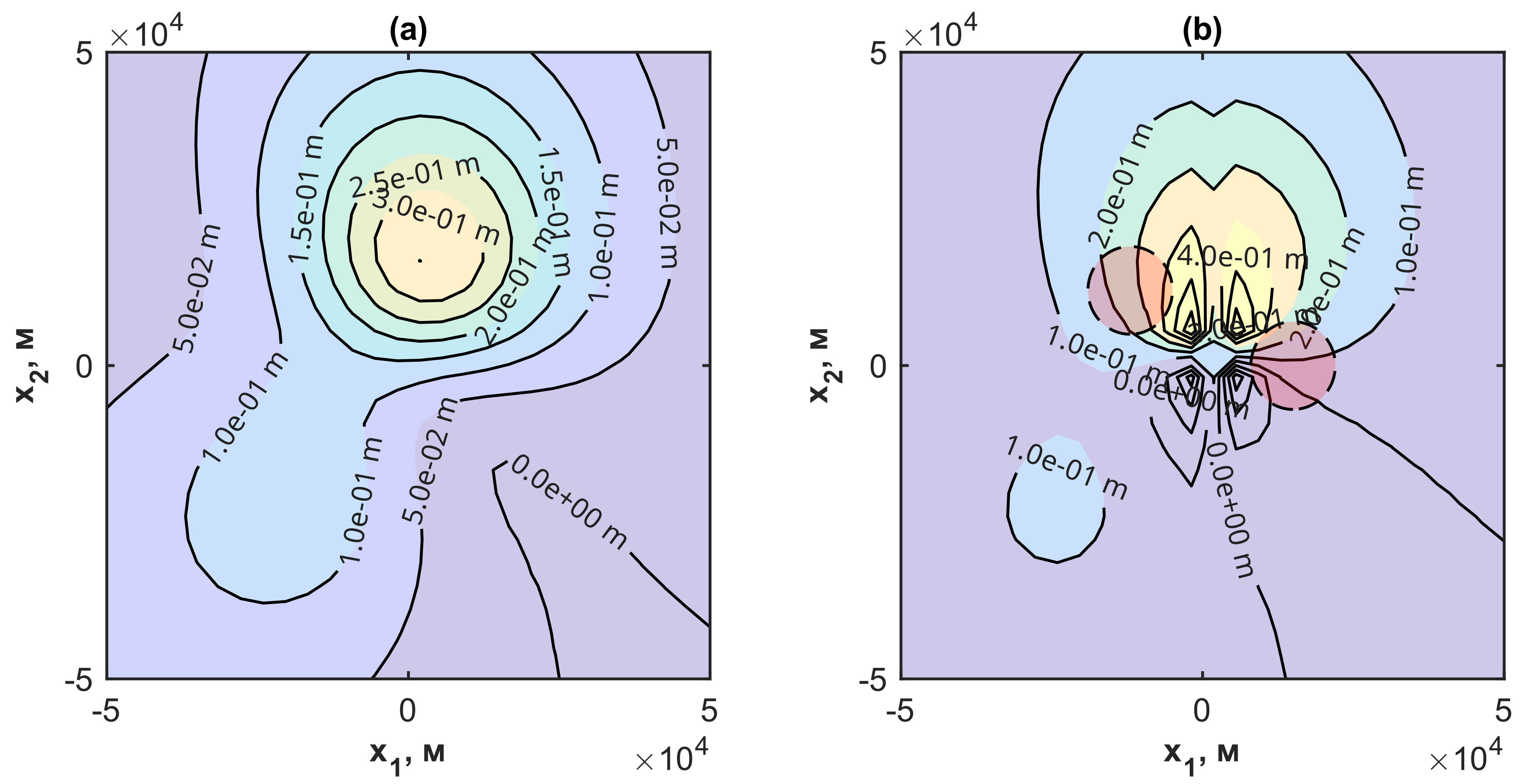 [Figure 5. Result of the computational experiment 2. Component u1 of the shift vector on the surface x3 = 0 in case of homogeneous environment (a) and with a spherical inhomogeneity (b); 🟠 projection of the spherical inhomogeneity on the surface x3 = 0.]