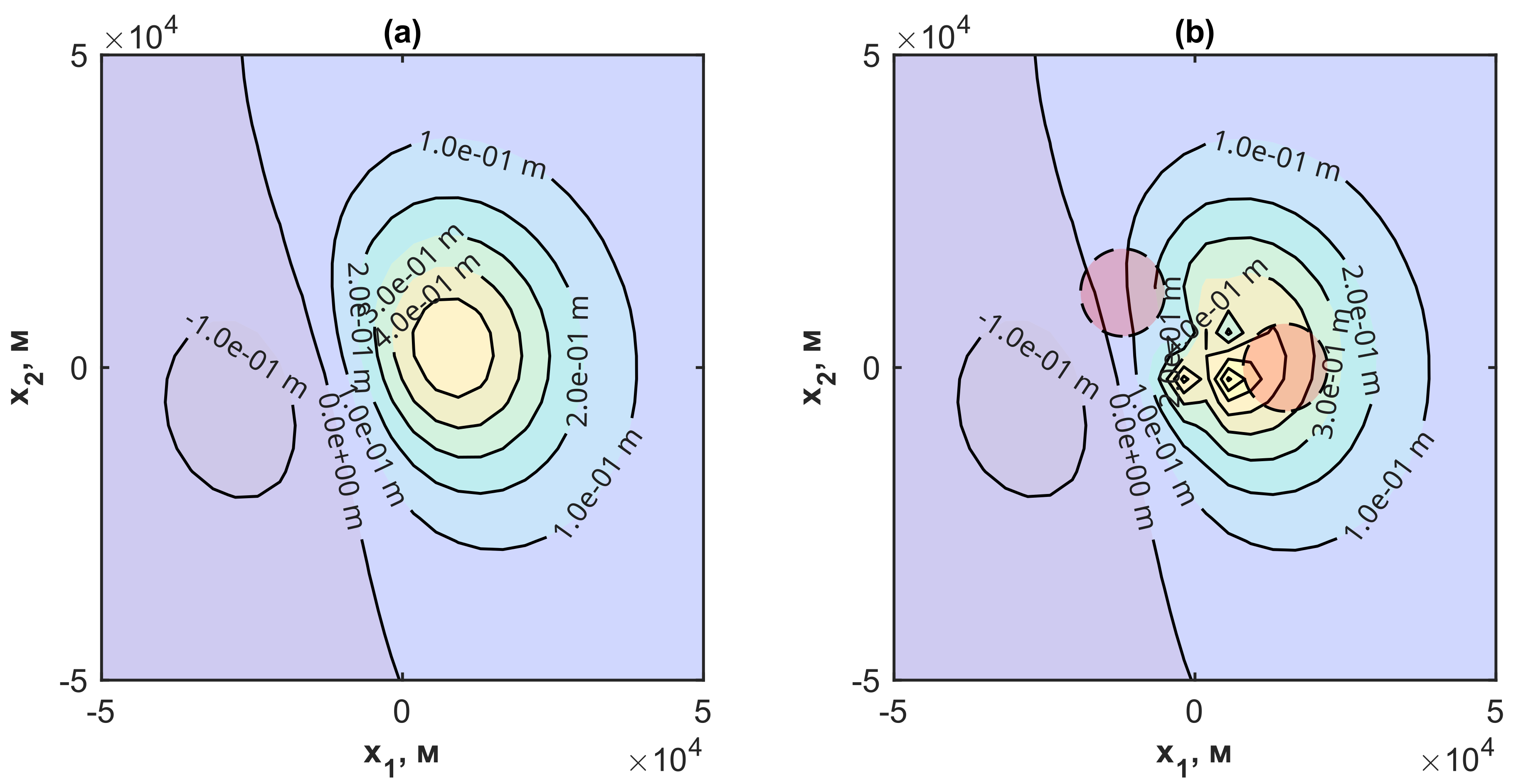 [Figure 8. Result of the computational experiment №3. Component u1 of the shift vector on the surface x3 = 0 in case of homogeneous environment (a) and with a spherical inhomogeneity (b); 🟠 projection of the spherical inhomogeneity on the surface x3 = 0.]