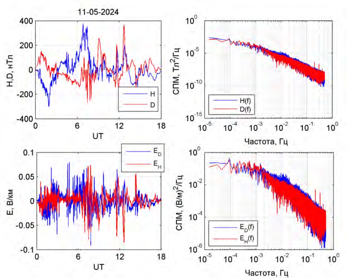 На рис. 3 показаны вариации северной Н и восточной D составляющих ГМП 11 мая 2024 г., их спектр, а также расчётный спектр геоэлектрического поля и вариации его компонент. Сравнение показывает, что наклон спектра ГМП гораздо больше, т. к. при умножении на передаточную функцию, размах значений которой составляет два порядка (см. рис. 2б), снижается размах значений спектральной плотности мощности: для геоэлектрического поля он составляет три порядка, в то время как для геомагнитного пять.