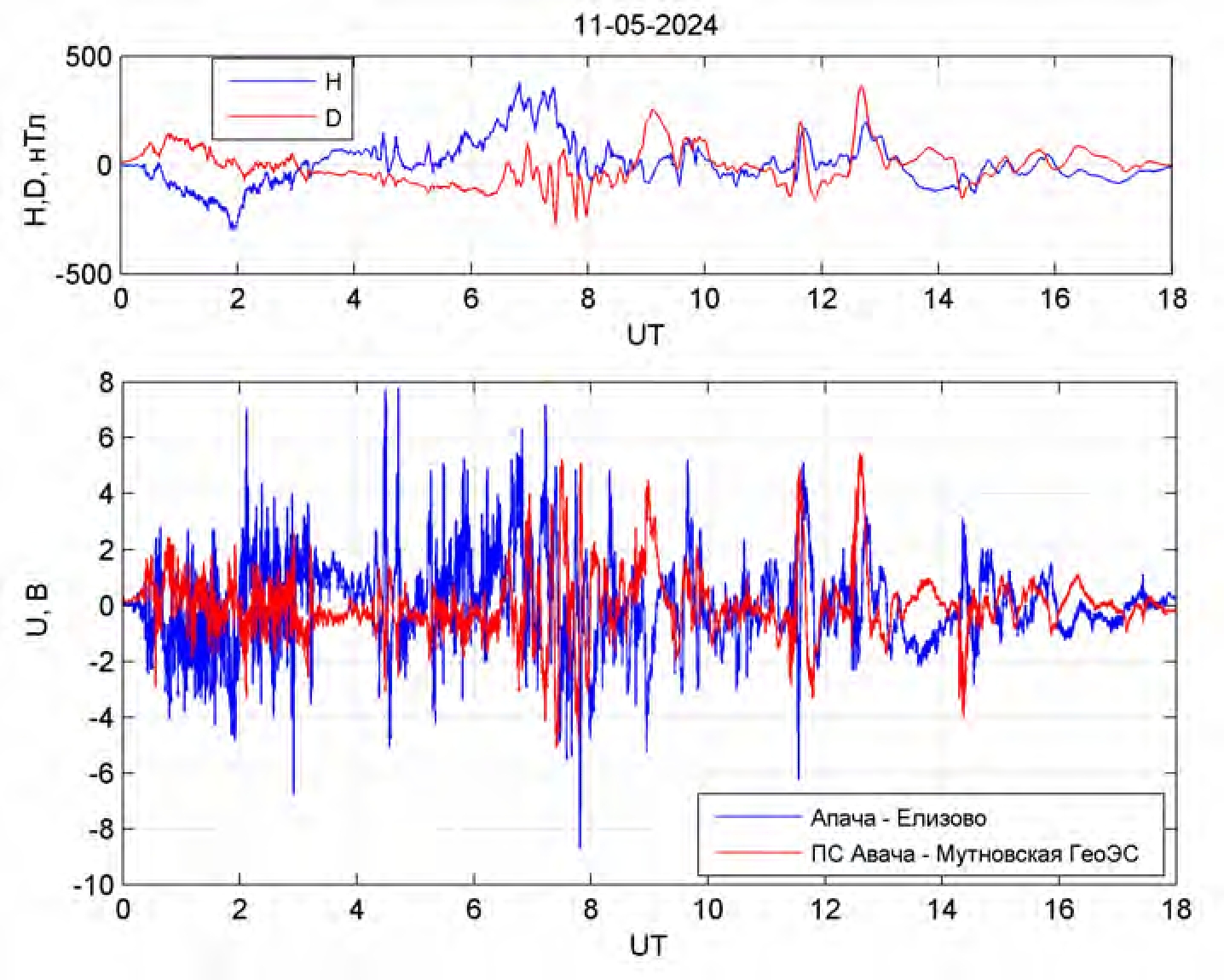 Рис. 4. Вариации компонент ГМП (верхняя панель) и расчётных напряжений на ЛЭП (нижняя панель) 11 мая 2024 г.