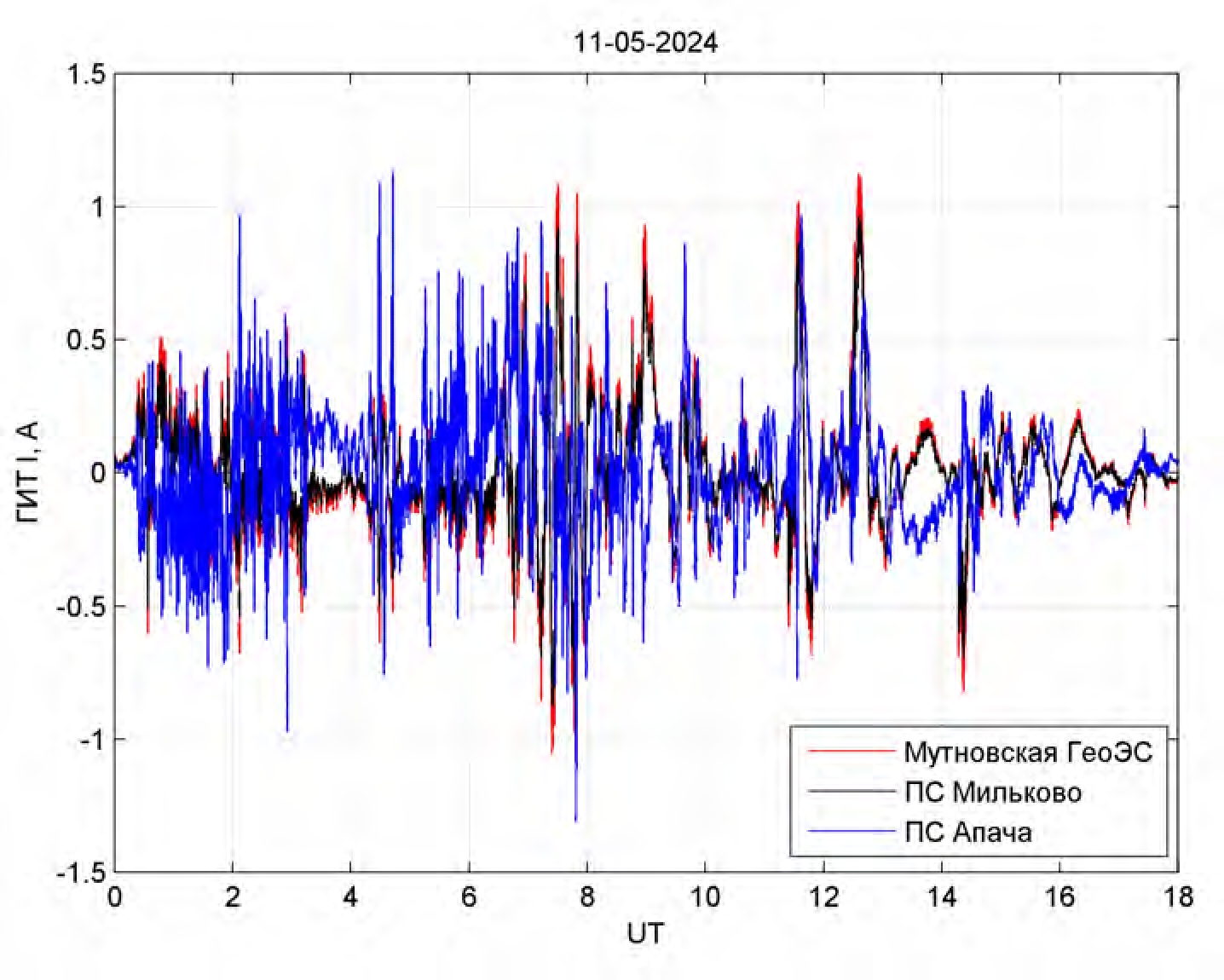 Рис. 5. Вариации расчётного ГИТ в ЛЭП 220 кВ «Мутновская ГеоЭС ПС «Авача», на подстанциях 110 кВ «Мильково» и «Апача» 11 мая 2024 г.
