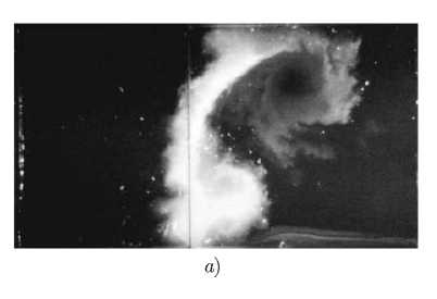 Рис. 5.1. Задача 1 – картина течения на момент времени 4 046 мкс: a) эксперимент [14]; b) результаты расчетов (концентрация)