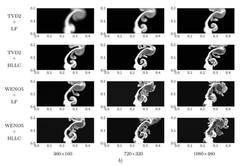 На Рис. 5.1 показаны результаты расчетов различными методами на сетках размерности 360×160 MathType@MTEF@5@5@+= feaahGart1ev3aaatCvAUfeBSjuyZL2yd9gzLbvyNv2CaerbuLwBLn hiov2DGi1BTfMBaeXatLxBI9gBaerbd9wDYLwzYbItLDharqqtubsr 4rNCHbGeaGqiVu0Je9sqqrpepC0xbbL8F4rqqrFfpeea0xe9Lq=Jc9 vqaqpepm0xbba9pwe9Q8fs0=yqaqpepae9pg0FirpepeKkFr0xfr=x fr=xb9adbaqaaeGaciGaaiaabeqaamaabaabaaGcbaGaaG4maiaaiA dacaaIWaGaey41aqRaaGymaiaaiAdacaaIWaaaaa@3C7A@ , 720×320 MathType@MTEF@5@5@+= feaahGart1ev3aaatCvAUfeBSjuyZL2yd9gzLbvyNv2CaerbuLwBLn hiov2DGi1BTfMBaeXatLxBI9gBaerbd9wDYLwzYbItLDharqqtubsr 4rNCHbGeaGqiVu0Je9sqqrpepC0xbbL8F4rqqrFfpeea0xe9Lq=Jc9 vqaqpepm0xbba9pwe9Q8fs0=yqaqpepae9pg0FirpepeKkFr0xfr=x fr=xb9adbaqaaeGaciGaaiaabeqaamaabaabaaGcbaGaaG4naiaaik dacaaIWaGaey41aqRaaG4maiaaikdacaaIWaaaaa@3C78@  и 1080×480 MathType@MTEF@5@5@+= feaahGart1ev3aaatCvAUfeBSjuyZL2yd9gzLbvyNv2CaerbuLwBLn hiov2DGi1BTfMBaeXatLxBI9gBaerbd9wDYLwzYbItLDharqqtubsr 4rNCHbGeaGqiVu0Je9sqqrpepC0xbbL8F4rqqrFfpeea0xe9Lq=Jc9 vqaqpepm0xbba9pwe9Q8fs0=yqaqpepae9pg0FirpepeKkFr0xfr=x fr=xb9adbaqaaeGaciGaaiaabeqaamaabaabaaGcbaGaaGymaiaaic dacaaI4aGaaGimaiabgEna0kaaisdacaaI4aGaaGimaaaa@3D39@ . Видно, что использование солвера HLLC для вычисления дискретных потоков позволяет воспроизвести корректную картину течения даже на грубой сетке, а использование реконструкции WENO5 позволяет смоделировать достаточно подробную структуру течения.