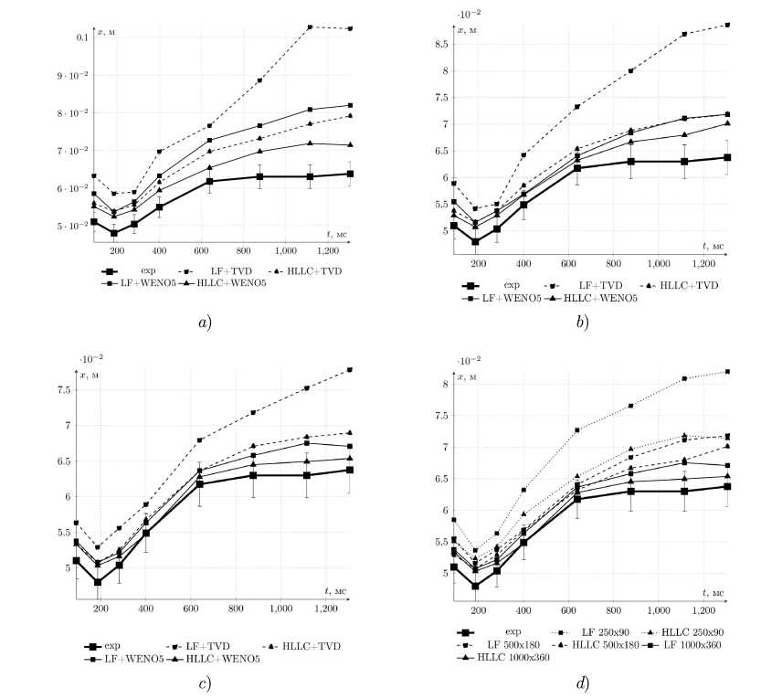 Fig 5.4. Dynamics of the width of the region with heavy gas: a MathType@MTEF@5@5@+= feaahGart1ev3aaatCvAUfeBSjuyZL2yd9gzLbvyNv2CaerbuLwBLn hiov2DGi1BTfMBaeXatLxBI9gBaerbd9wDYLwzYbItLDharqqtubsr 4rNCHbGeaGqiVu0Je9sqqrpepC0xbbL8F4rqqrFfpeea0xe9Lq=Jc9 vqaqpepm0xbba9pwe9Q8fs0=yqaqpepae9pg0FirpepeKkFr0xfr=x fr=xb9adbaqaaeGaciGaaiaabeqaamaabaabaaGcbaGaamyyaaaa@36DD@  ) grid 250×90 MathType@MTEF@5@5@+= feaahGart1ev3aaatCvAUfeBSjuyZL2yd9gzLbvyNv2CaerbuLwBLn hiov2DGi1BTfMBaeXatLxBI9gBaerbd9wDYLwzYbItLDharqqtubsr 4rNCHbGeaGqiVu0Je9sqqrpepC0xbbL8F4rqqrFfpeea0xe9Lq=Jc9 vqaqpepm0xbba9pwe9Q8fs0=yqaqpepae9pg0FirpepeKkFr0xfr=x fr=xb9adbaqaaeGaciGaaiaabeqaamaabaabaaGcbaGaaGOmaiaaiw dacaaIWaGaey41aqRaaGyoaiaaicdaaaa@3BC0@ ; b MathType@MTEF@5@5@+= feaahGart1ev3aaatCvAUfeBSjuyZL2yd9gzLbvyNv2CaerbuLwBLn hiov2DGi1BTfMBaeXatLxBI9gBaerbd9wDYLwzYbItLDharqqtubsr 4rNCHbGeaGqiVu0Je9sqqrpepC0xbbL8F4rqqrFfpeea0xe9Lq=Jc9 vqaqpepm0xbba9pwe9Q8fs0=yqaqpepae9pg0FirpepeKkFr0xfr=x fr=xb9adbaqaaeGaciGaaiaabeqaamaabaabaaGcbaGaamOyaaaa@36DE@  ) grid 500×180 MathType@MTEF@5@5@+= feaahGart1ev3aaatCvAUfeBSjuyZL2yd9gzLbvyNv2CaerbuLwBLn hiov2DGi1BTfMBaeXatLxBI9gBaerbd9wDYLwzYbItLDharqqtubsr 4rNCHbGeaGqiVu0Je9sqqrpepC0xbbL8F4rqqrFfpeea0xe9Lq=Jc9 vqaqpepm0xbba9pwe9Q8fs0=yqaqpepae9pg0FirpepeKkFr0xfr=x fr=xb9adbaqaaeGaciGaaiaabeqaamaabaabaaGcbaGaaGynaiaaic dacaaIWaGaey41aqRaaGymaiaaiIdacaaIWaaaaa@3C78@ ; c MathType@MTEF@5@5@+= feaahGart1ev3aaatCvAUfeBSjuyZL2yd9gzLbvyNv2CaerbuLwBLn hiov2DGi1BTfMBaeXatLxBI9gBaerbd9wDYLwzYbItLDharqqtubsr 4rNCHbGeaGqiVu0Je9sqqrpepC0xbbL8F4rqqrFfpeea0xe9Lq=Jc9 vqaqpepm0xbba9pwe9Q8fs0=yqaqpepae9pg0FirpepeKkFr0xfr=x fr=xb9adbaqaaeGaciGaaiaabeqaamaabaabaaGcbaGaam4yaaaa@36DF@  ) grid 1000×360 MathType@MTEF@5@5@+= feaahGart1ev3aaatCvAUfeBSjuyZL2yd9gzLbvyNv2CaerbuLwBLn hiov2DGi1BTfMBaeXatLxBI9gBaerbd9wDYLwzYbItLDharqqtubsr 4rNCHbGeaGqiVu0Je9sqqrpepC0xbbL8F4rqqrFfpeea0xe9Lq=Jc9 vqaqpepm0xbba9pwe9Q8fs0=yqaqpepae9pg0FirpepeKkFr0xfr=x fr=xb9adbaqaaeGaciGaaiaabeqaamaabaabaaGcbaGaaGymaiaaic dacaaIWaGaaGimaiabgEna0kaaiodacaaI2aGaaGimaaaa@3D2E@ ; d MathType@MTEF@5@5@+= feaahGart1ev3aaatCvAUfeBSjuyZL2yd9gzLbvyNv2CaerbuLwBLn hiov2DGi1BTfMBaeXatLxBI9gBaerbd9wDYLwzYbItLDharqqtubsr 4rNCHbGeaGqiVu0Je9sqqrpepC0xbbL8F4rqqrFfpeea0xe9Lq=Jc9 vqaqpepm0xbba9pwe9Q8fs0=yqaqpepae9pg0FirpepeKkFr0xfr=x fr=xb9adbaqaaeGaciGaaiaabeqaamaabaabaaGcbaGaamizaaaa@36E0@  ) WENO5 scheme with LF and HLLC fluxes on condensed grids