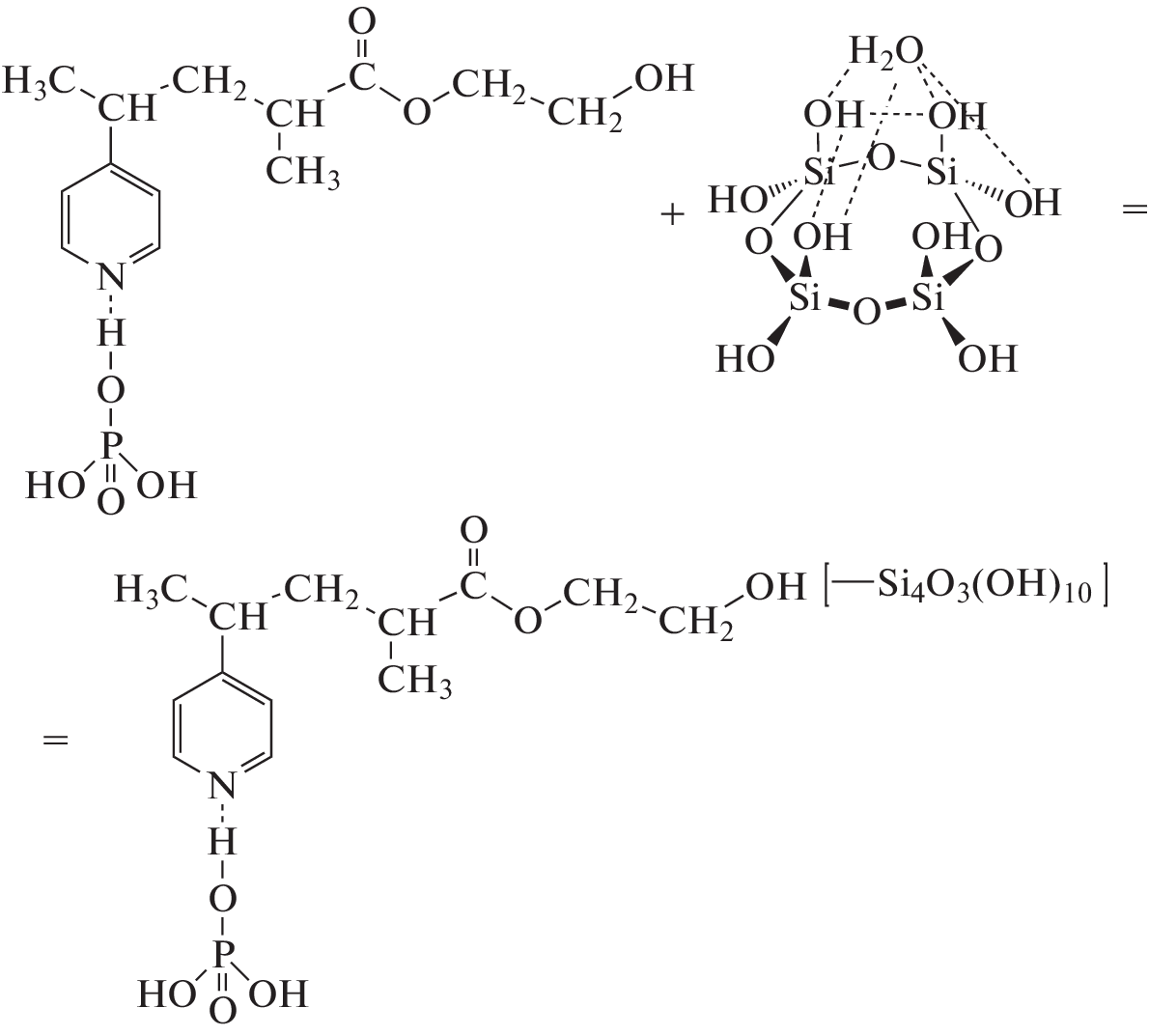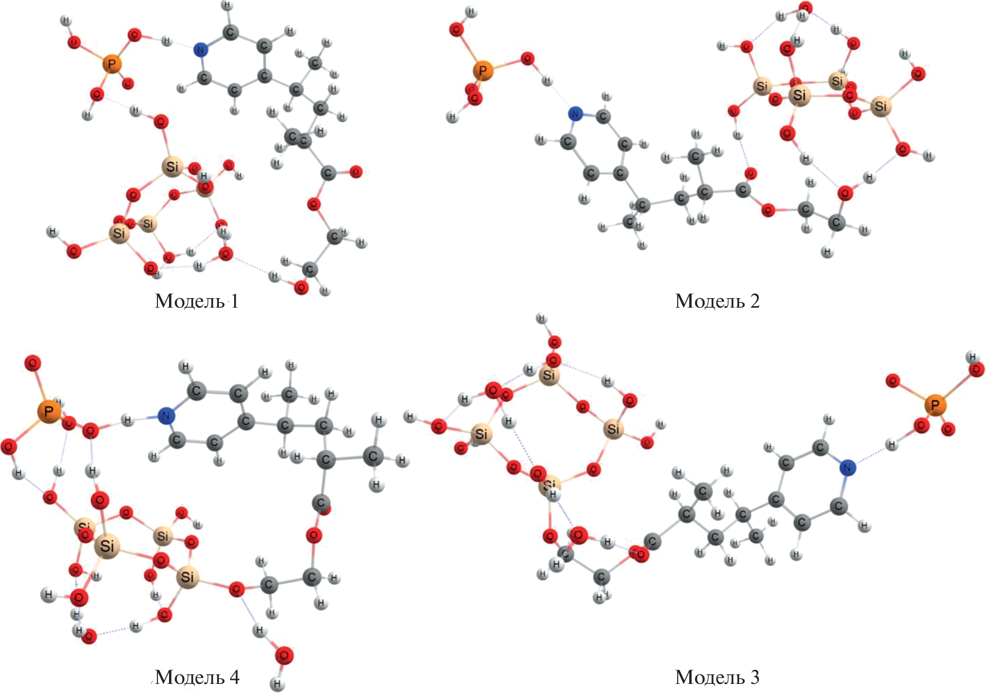 Hybrid organic-inorganic membranes based on tetraethoxysilane and orthophosphoric acid-doped copolymers of 4-vinylpyridine (4-VP) and 2-hydroxyethyl methacrylate (HEMA) were formed by the sol-gel synthesis method. The membranes are characterized by high values of exchange capacity and proton conductivity. An increase in the proton conductivity of hybrid organo-inorganic membranes compared to the initial copolymer can be associated with the generation of water of crystallization during the formation of a silicon dioxide fragment, which follows from quantum-chemical modeling of the local structure of the membrane, which includes an organic part from the copolymerization product of 4-VP with HEMA (44 atoms) and an inorganic part of 27 atoms, repeating the structure of the silicon dioxide block.