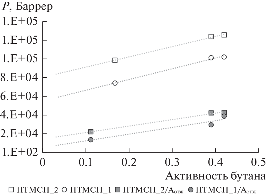 In this work, for the first time, we studied the permeability of individual lower hydrocarbons and in a C1/C4 mixture for films based on PTMSP of a new cis-enriched configurational composition (the content of cis-units in the samples was 80 and 90%). The methane permeability of freshly prepared cis-regular PTMSP films (90% of cis-units) exposed to air for a month is higher than the corresponding values of PTMSP films with 80% cis-units. The X-ray diffraction data indicate a looser packing of the cis-regular PTMSP. The introduction of the antioxidant Irganox 1076 into PTMSP films leads to a decrease in the initial level of the methane flux. At the same time, the permeability of films with the addition of Irganox 1076 over time (within 1 month) decreases much more slowly compared to films without the addition of an antioxidant. The permeability of individual lower hydrocarbons through PTMSP films without and with the addition of Irganox 1076 increases in the order С1 < C2 < C3 < C4. The value of the separation factor in the n-butane/methane mixture reaches 33, which is almost 7 times higher than the selectivity for individual components. The high level of n‑butane permeability of cis-enriched PTMSP is maintained for at least a month of films storage in air.
