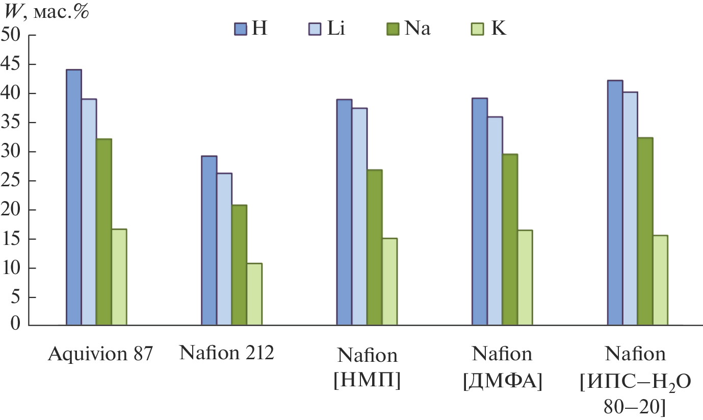 In this work, the study of water uptake, ionic conductivity, and Donnan potential in systems with perfluorosulfonic acid membranes in H+, Li+, Na+, and K+ forms and solutions of inorganic electrolytes is presented. The properties of the commercial Aquivion E87-05S and Nafion 212 membranes, as well as the membranes prepared from the dispersions of Nafion 212 in the solvents of different nature (N,N-dimethylformamide, 1‑methyl-2-pyrrolidone, isopropyl alcohol–water mixtures in volume ratio of 80–20) were investigated. The influence of the number of functional groups, the length of the side chains of the polymer macromolecules, and the polymer morphology in the membranes on their equilibrium and transport properties depending on the counter-ion nature was revealed. The effect of the relaxation and electrophoretic factors on the alkali metal ion transfer through the system of pores and channels of the perfluorosulfonic acid membranes was discussed. The slope of the concentration dependencies of the Donnan potential for all highly hydrated membranes in the H+ form was close to the Nernstian one, while the selectivity to the alkali metal ions increased for the membranes with the highest ion-exchange capacity or the lowest amount of sorbed water and diffusion permeability due to the exclusion of the co-ions from the membrane phase.