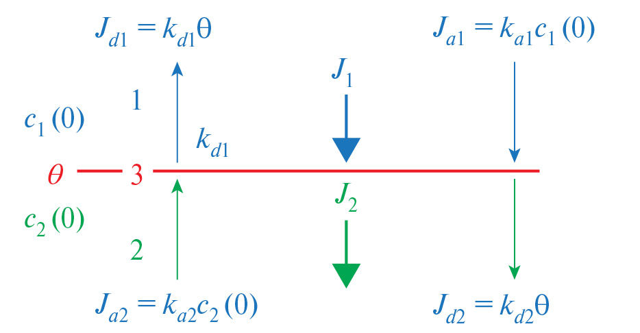 где – коэффициенты адсорбции и десорбции i-го слоя на границе мембранных слоев, θ – концентрация газа на границе между слоями, и – концентрация газа вблизи границы между слоями в 1-м и 2-м мембранных слоях соответственно, Ji – диффузионный поток через i-й мембранный слой, li – толщина i-го слоя, – коэффициент диффузии газа в i-м слое, – толщина бислойной мембраны, и – концентрации газа на внешних границах 1-го и 2-го слоя, – адсорбционные и десорбционные потоки соответственно.