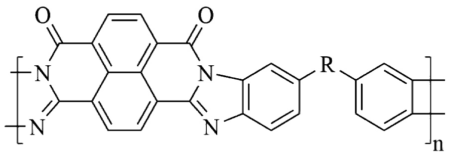Среди перспективных полимерных материалов, которые могут эксплуатироваться в жестких условиях высокотемпературных нефтехимических процессов, особое место занимают частично-лестничные полинафтоиленбензимидазолы (ПНБИ) с общей структурной формулой, представленной на рис. 1. ПНБИ при идеальном химическом строении, то есть на 100% зациклизованные, без ветвлений и дефектных звеньев, обладают предельно высокой термостойкостью (до 550°С в условиях ТГА на воздухе), хорошей пленко- и волокнообразующей способностью, огнестойкостью, высокой химической, гидролитической и радиационной стабильностью [1–4].