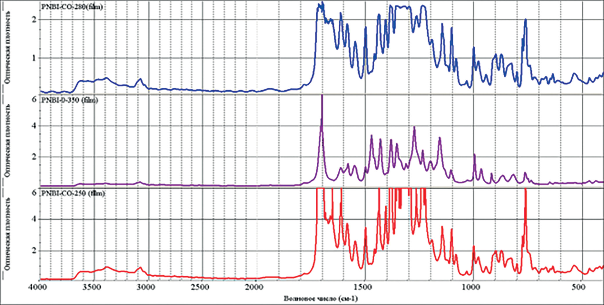 Твердофазная полициклизация пленок ПАНИ в ПНБИ осуществлялась путем их прогрева в различных температурных режимах от 150 до 400°С. Степень завершенности полициклизации определяли по ИК-спектрам по ходу термообработки образцов. В частности, сравнение спектров пленок ПАНИ, прогретых при различных температурах, показывает, что при 350–400°С все ПАНИ практически полностью преобразуются в ПНБИ. Об этом свидетельствует отсутствие полос поглощения, характерных для недоциклизованных структур: дублета 1680–1720 (С=О нафтоиленимида) и 3300–3500 см-1(NH2-). Наличие максимумов поглощения при 1620, 1380, 1240, 1710 см-1 характерно для ПНБИ системы. Следует отметить, что процессы циклизации пленок ПАНИ-СО и ПАНИ-SO2 при 250–300°С идут не до конца, что, по-видимому, связано с низкой основностью о-аминогрупп в 4‚4`- положениях ТАБФ и ТАДФС. В качестве примера на рис. 3 приведены ИК-спектры пленок ПАНИ-СО, термообработанных при 250 и 280°С в сравнении с пленкой ПНБИ-О, полученной при 350°С. Было установлено, что проводить термообработку в более жестких температурных режимах нецелесообразно, поскольку при этом резко ухудшаются механические свойства образцов. Так, при циклизации ПАНИ-СО в ПНБИ-СО при температурах выше 280°С получаются очень хрупкие пленки, для которых проводить дальнейшие измерения практически невозможно.
