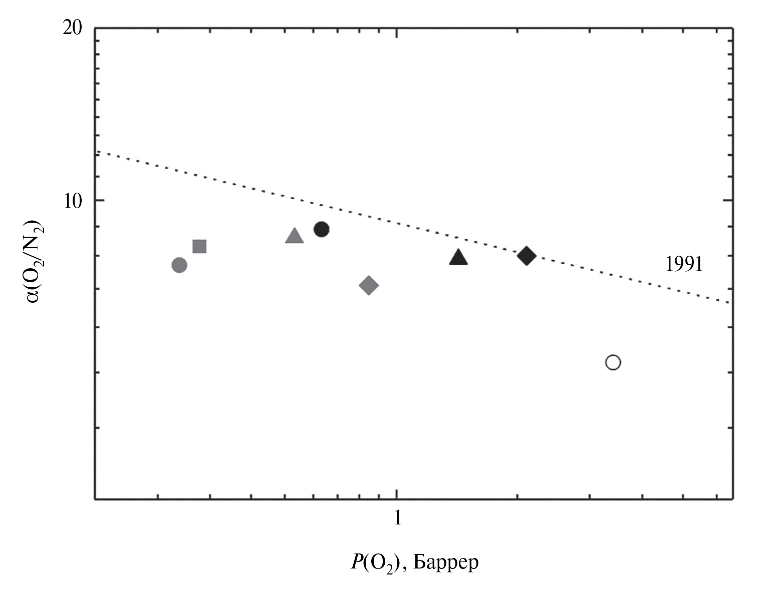 5. Fig. 4. Fragment of the Robson diagram from 1991 [8] for the oxygen – nitrogen gas pair. Circles: white – PANI-O, grey – incompletely cyclized PNBI-O [7], black – completely cyclized PNBI-O [6]. Diamonds: grey – incompletely cyclized PNBI-σ [7], black – completely cyclized PNBI-σ [6]. Square – PNBI-SO (250). Triangles: grey – PNBI-SO2 (280), black – PNBI-SO2 (320) completely cyclized.