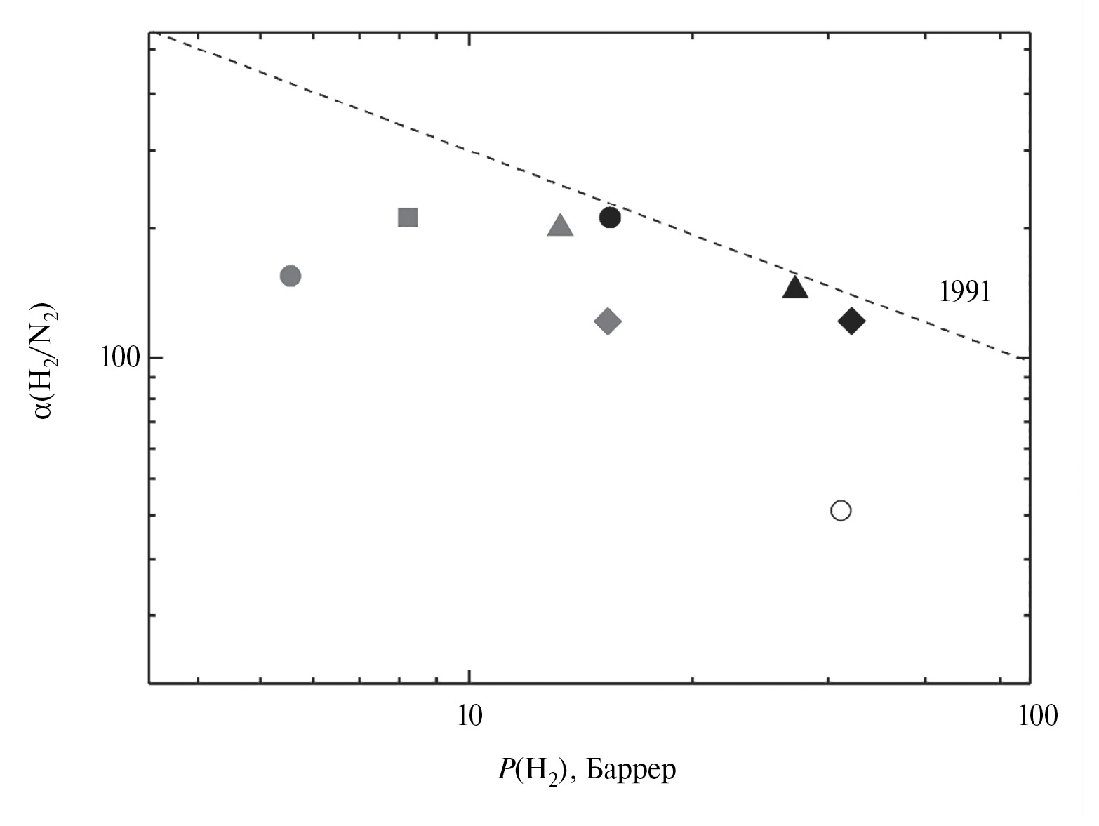 6. Fig. 5. Fragment of the Robson diagram from 1991 [8] for the hydrogen – nitrogen gas pair. Circles: white – PANI-O, grey – incompletely cyclized PNBI-O [7], black – completely cyclized PNBI-O [6]. Diamonds: grey – incompletely cyclized PNBI-σ [7], black – completely cyclized PNBI-σ [6]. Square – PNBI-SO (250). Triangles: grey – PNBI-SO2 (280), black – completely cyclized PNBI-SO2 (320).