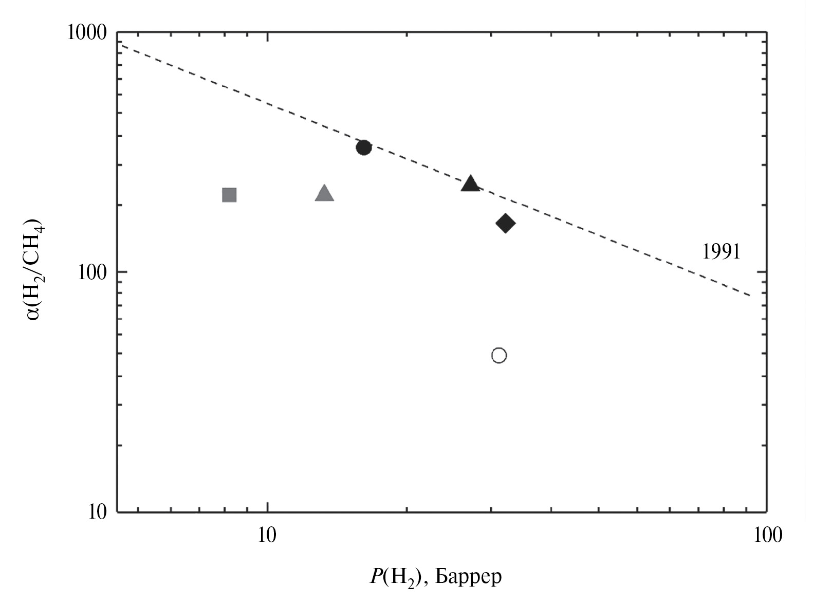 7. Fig. 6. Fragment of the Robson diagram from 1991 [8] for the hydrogen – methane gas pair. Circles: white – PANI-O, black – completely cyclized PNBI-O [6]. Rhombus – completely cyclized PNBI-σ [6]. Square – PNBI-SO (250). Triangles: gray – PNBI-SO2 (280), black – PNBI-SO2 (320) – completely cyclized.