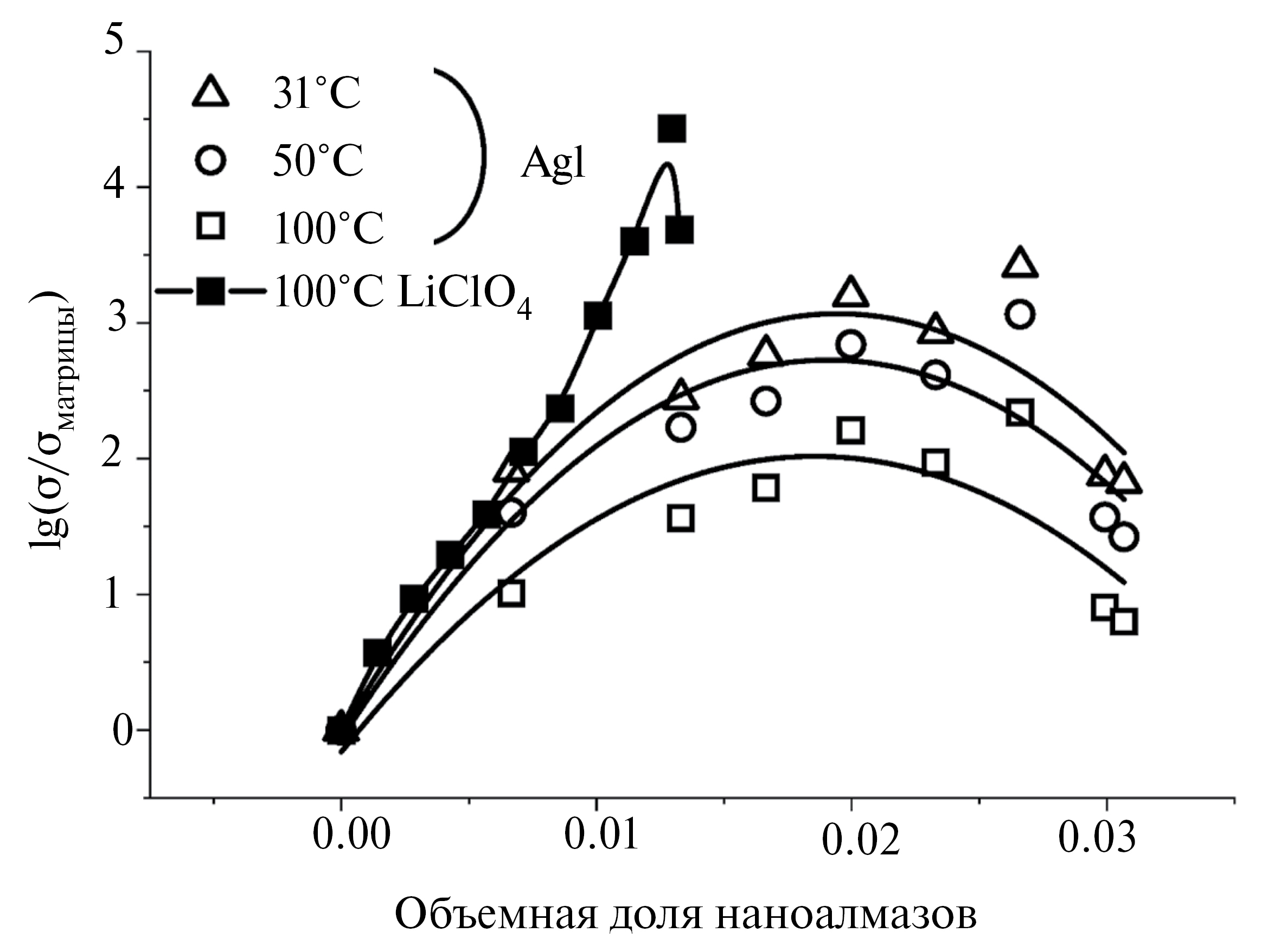 В работах [22–24] изучены композиционные системы на основе AgI [22] и LiClO4 [23, 24] с гетерогенной добавкой алмазов в нанодисперсном состоянии (СНД). В обоих случаях авторы отмечают отсутствие химического взаимодействия между основной фазой и наноалмазами. Композиционный эффект увеличения электропроводности (см. рис. 1) составляет около трех и пяти порядков величины, соответственно. Авторы этих работ предполагают, что введение наноалмазов в матрицу AgI приводит к стабилизации модификаций β-AgI, γ-AgI [22], локализующихся в межзеренном пространстве индивидуальных фаз AgI и СНД.