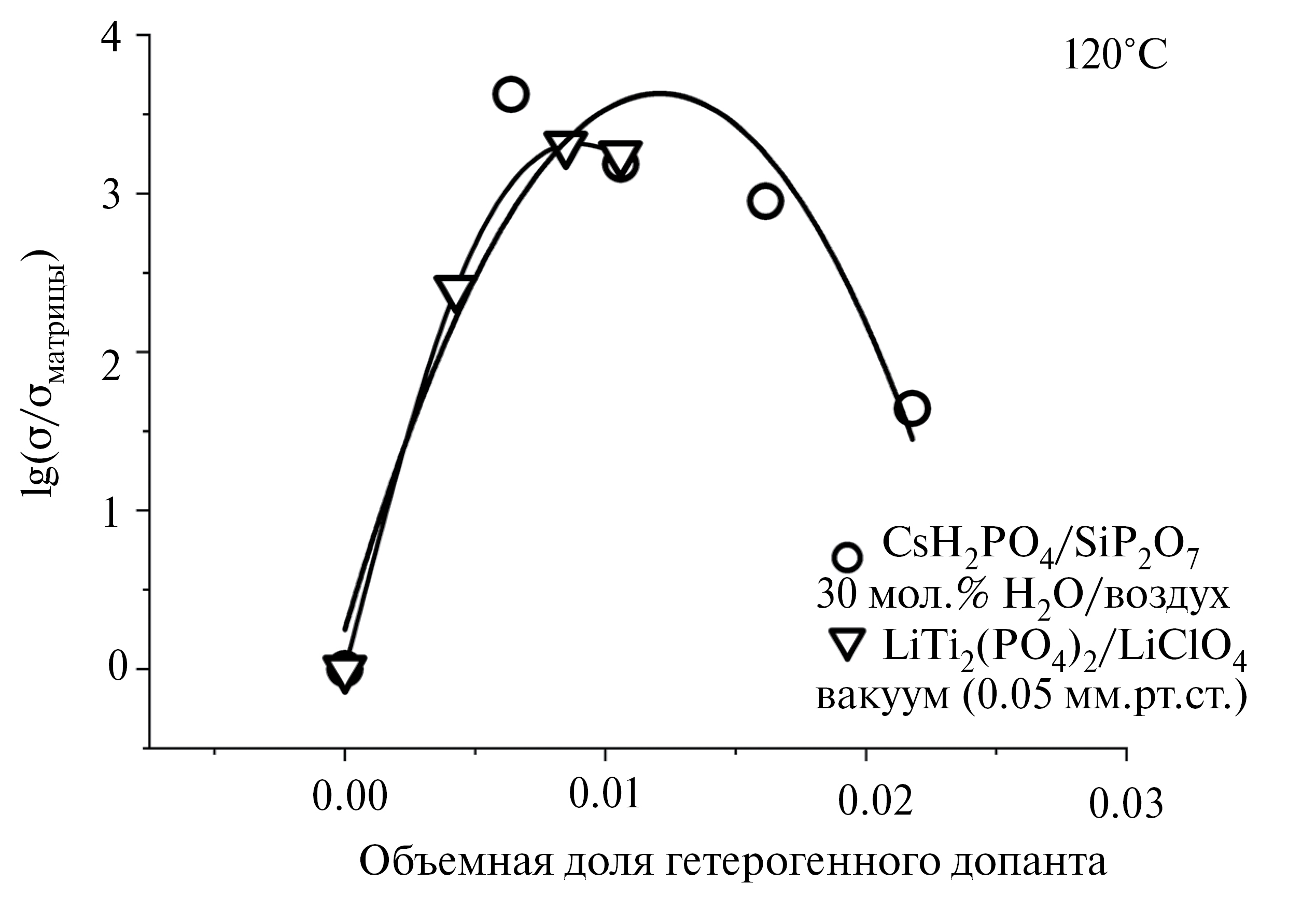 Авторы работ [25, 26, 28, 29] изучали электропроводность композиционных образцов на основе CsH5(PO4)2. Гетерогенным допантом выступали добавки SiP2O7, TiP2O7 [26]. Композиционные образцы в системе CsH5(PO4)2–SiP2O7 проявляют более высокие значения проводимости в сравнении с данными для CsH5(PO4)2. Независимо от количества SiP2O7 эффект увеличения электропроводности в интервале температур 150°–200°С находится в пределах 1 порядка величины [25]. К причинам возникновения КЭ авторы работы относят межфазное взаимодействие матрицы и допанта, ссылаясь на сходство с другими композиционными системами.