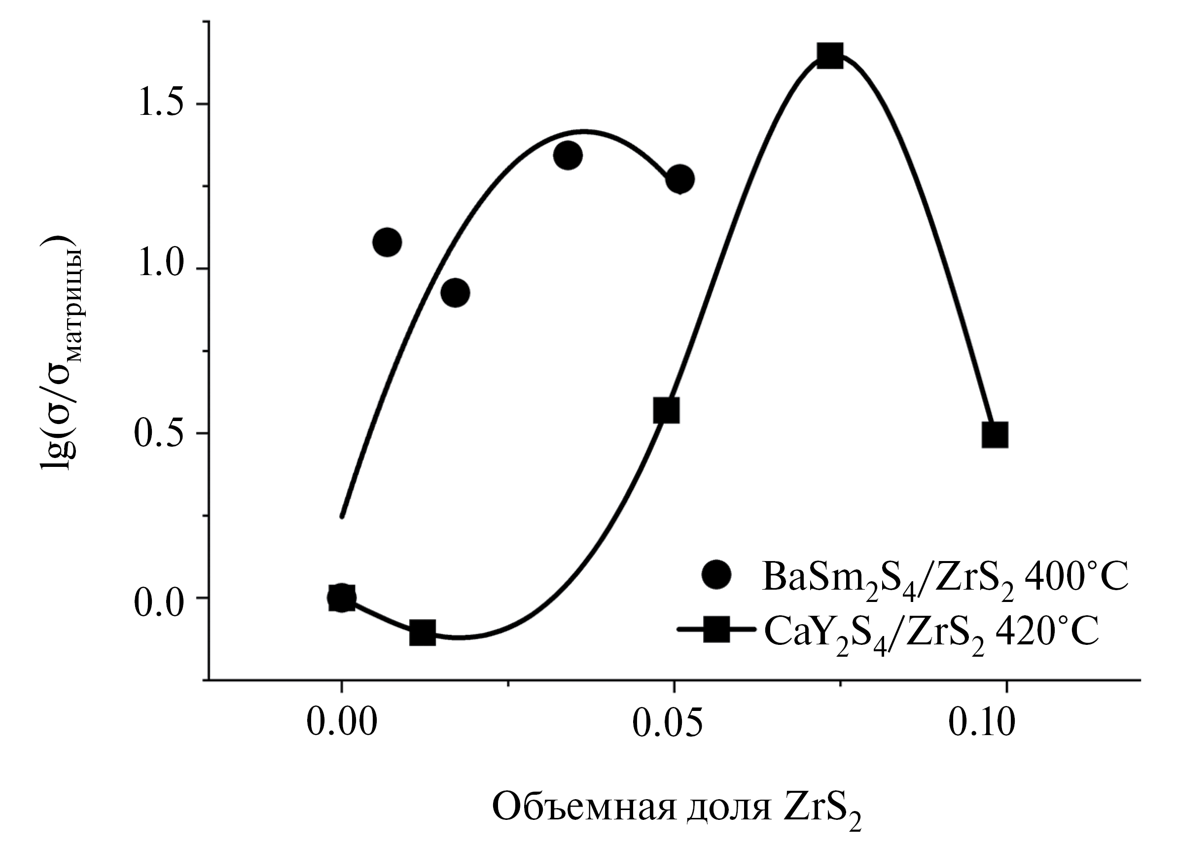 Методом гетерогенного допирования также модифицировали соединения состава MLn2S4 (M = Ba, Ca; Ln = Y, Sm, Yb) [32–34] добавкой сульфида циркония (IV). Введение гетерогенного допанта приводит к повышению общей и ионной электропроводности до двух порядков величины, концентрационные зависимости представлены на рис. 3, для матричных фаз при расчете ионной проводимости использованы данные работы [35]. Природа КЭ электропроводности объясняется авторами работы появлением на границах зерен высокопроводящего ионного соединения. Также отмечена роль метода приготовления композита: сульфидирование оксидной шихты, полученной по керамической технологии, приводит к получению композиционных электролитов с оптимальными свойствами вследствие более однородного распределения гетерогенного допанта по границам зерен.