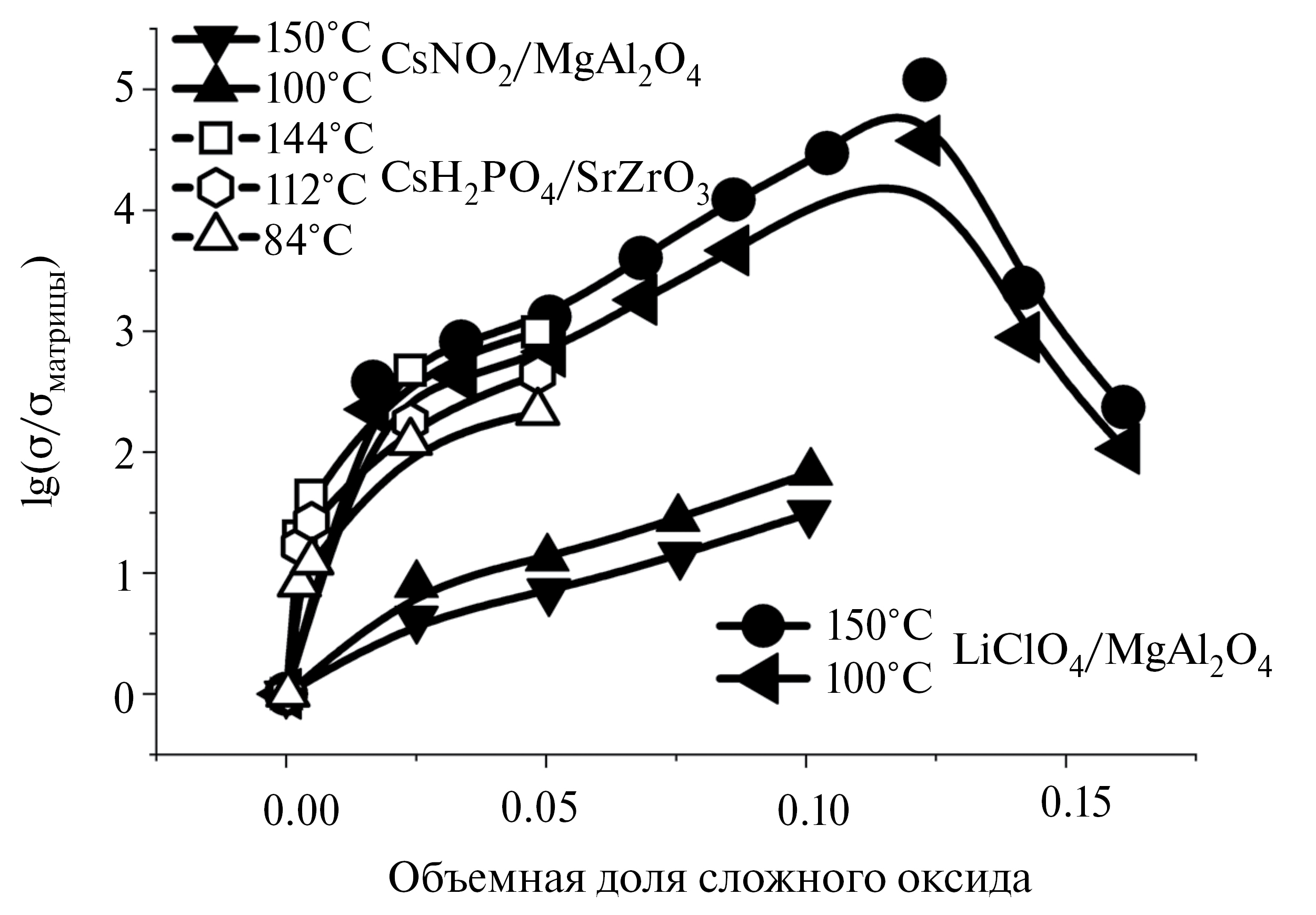 Авторами работ [46–48] изучены композиционные электролиты в системах CsH2PO4–SrZrO3 [46], CsNO2 [47] и LiClO4 [48] с гетерогенным допантом MgAl2O4. На рисунке 4 приведены концентрационные зависимости электропроводности композитов.