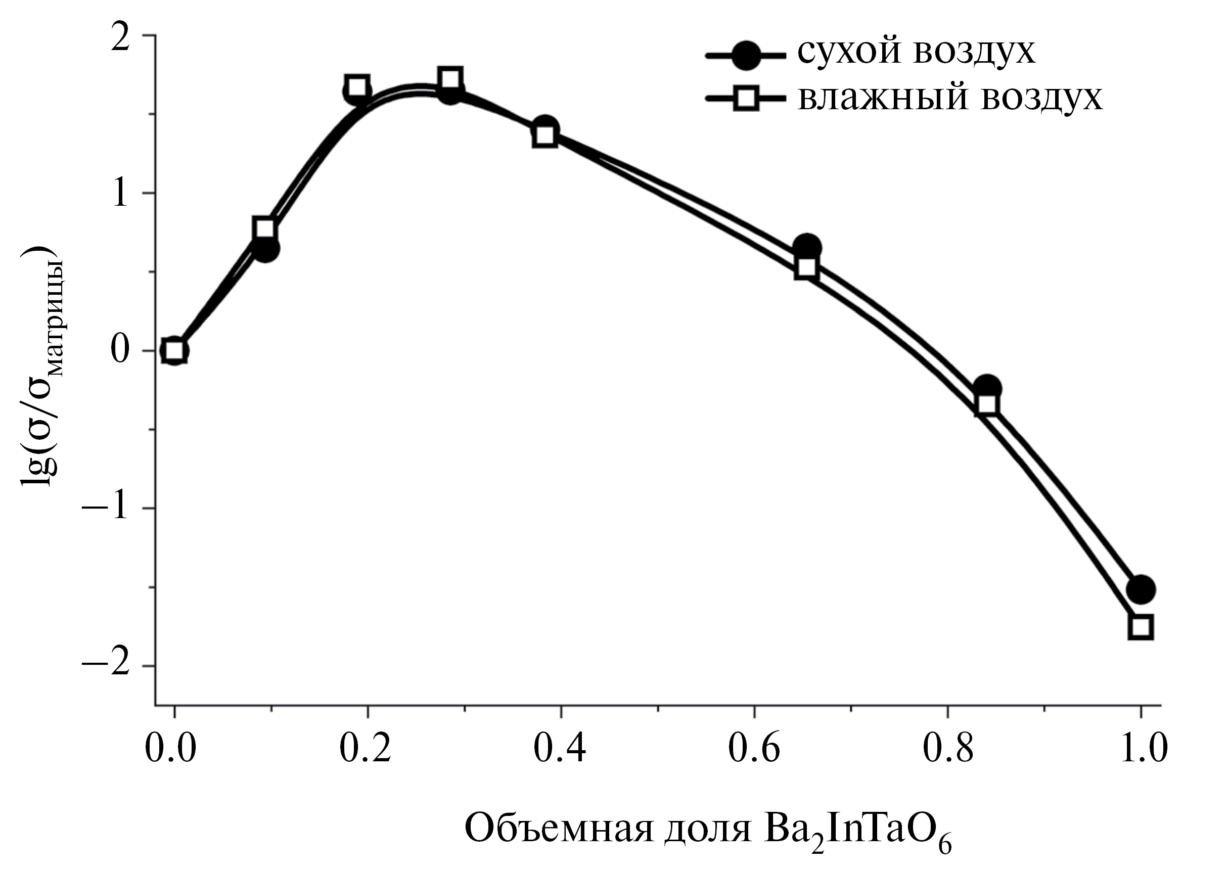 В работах [51–55] исследованы композиционные эвтектические электролиты на основе браунмиллерита Ba2In2O5 (или его твердых растворов Ba2In1.7W0.3O5.45 [54] и Ba2In1.57Al0.43O5 [55]) с гетерогенным допантом общей формулы Ba2InMO6 (M = Nb, Ta). Такие композиты с температурой обработки выше эвтектической демонстрируют увеличение общей электропроводности по сравнению с матричной фазой более чем на 1.5 порядка величины. Концентрационная зависимость электропроводности для системы Ba2In2O5–Ba2InTaO6 представлена на рис. 5. Авторы работы [53] к факторам, обуславливающим увеличение электропроводности, относят изменение микроструктуры композиционной керамики: при кристаллизации эвтектики появляется аморфизованный слой на поверхности зерен матричной фазы Ba2In2O5 и стабилизация ее высокотемпературной модификации, характеризующейся разупорядоченным расположением вакансий кислорода.