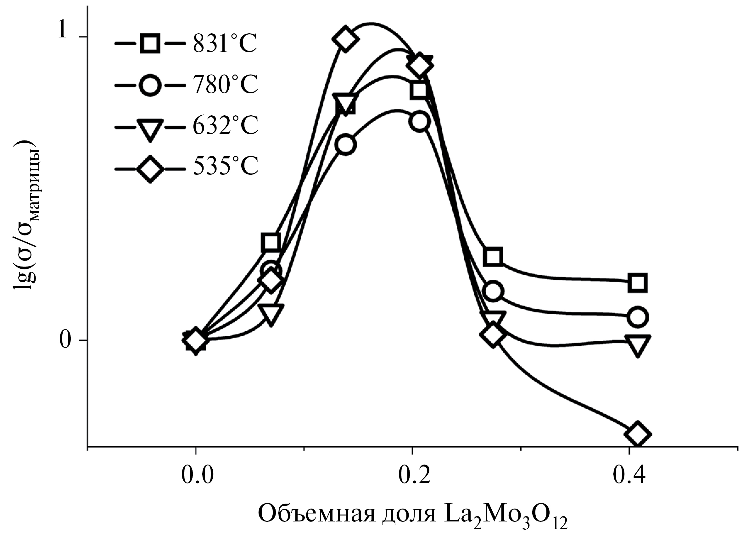 В работе [56] рассматриваются композиционные электролиты на основе димолибдата лантана в эвтектической системе La2Mo2O9–La2Mo3O12. Композиционные образцы с температурой обработки ниже температуры эвтектики демонстрируют увеличение объемной электропроводности (см. рис. 6), максимальный эффект увеличения электропроводности достигается для образца с 10 мол. % допанта и составляет один порядок величины. В отличие от вышеописанных композитных систем на основе Ba2In2O5 повышение электропроводности не было обусловлено стабилизацией высокотемпературной разупорядоченной модификации матричной фазы La2Mo2O9 [56]. Для этой системы доказано образование высокопроводящей фазы La5Mo3O16 на поверхности зерен между компонентами La2Mo2O9 и La2Mo3O12. Кроме того, образование фазы состава La5Mo3O16 приводило к нарушению стехиометрии La2Mo2O9 и дополнительному эффекту разупорядочения поверхности основной фазы La2Mo2O9.