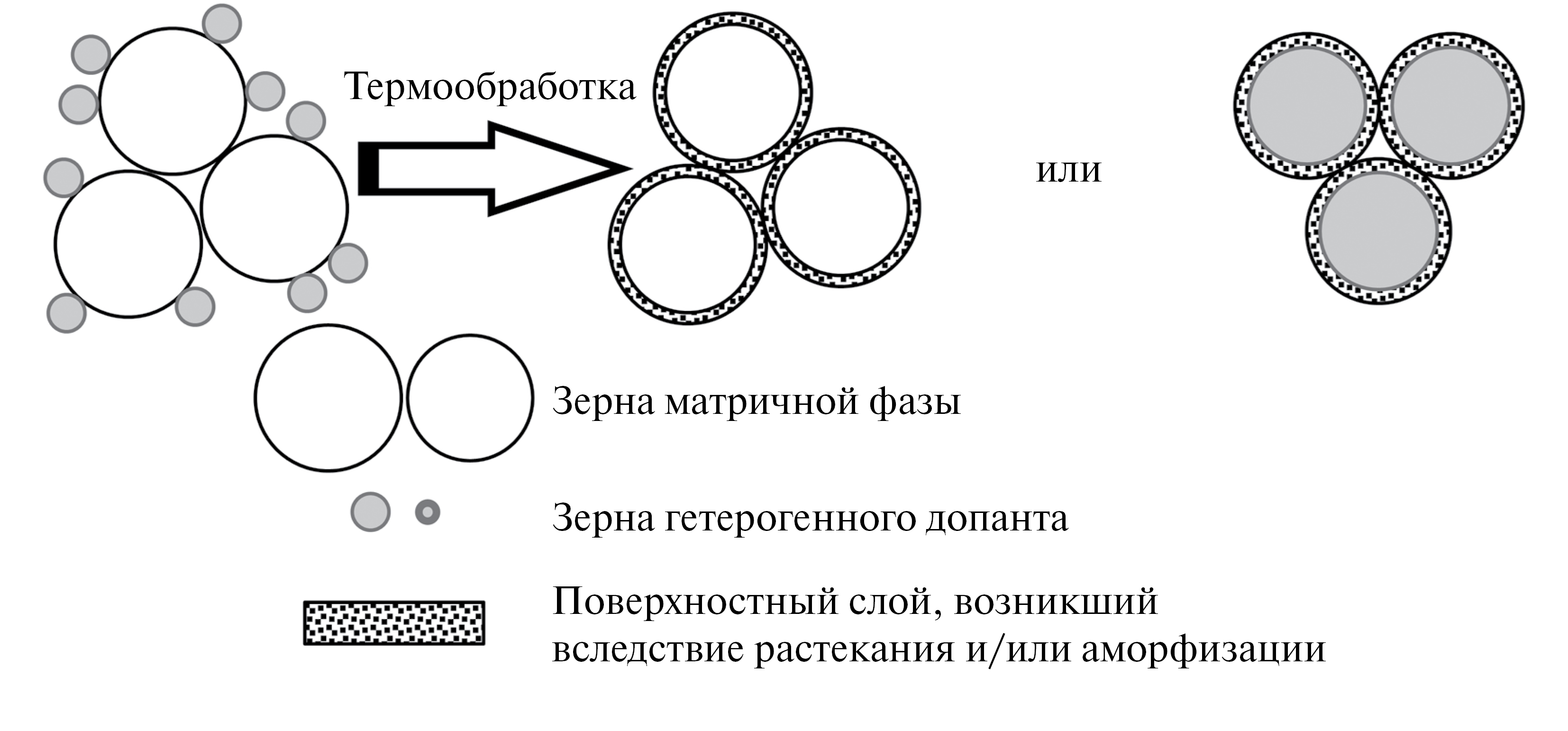 Опубликован ряд работ [36–42] по изучению композиционных электролитических систем типа “соль – простой оксид”, в которых были подтверждены закономерности влияния дисперсности, удельной поверхности гетерогенного допанта. Выделяется роль кислотно-основной природы простого оксида и связанных с этим эффектов, определяющих распределение фаз в композиционной керамике. Природа композиционного эффекта электропроводности обсуждается в ключе возникновения высокоразупорядоченных поверхностных участков или аморфизованных слоев на границе раздела фаз в композите [43–45].