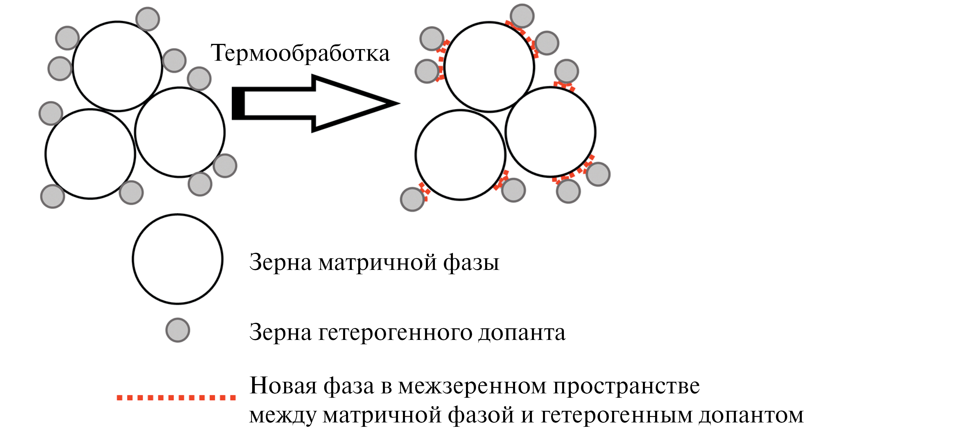 Для матрицы титаната лития Li4Ti5O12 в качестве гетерогенного допанта выбраны диэлектрики: простой оксид TiO2 [49, 50] и сложный оксид Li2TiO3 [50]. При гетерогенном допировании снижается величина зернограничного сопротивления, что объясняется с точки зрения образования когерентных границ между фазами и перераспределением катионов лития. Различия эффектов (1 порядок величины для гетерогенного допанта TiO2 и 2 порядка величины для Li2TiO3) объясняются разным сопряжением матрицы и гетерогенного допанта вследствие различий структурных типов.