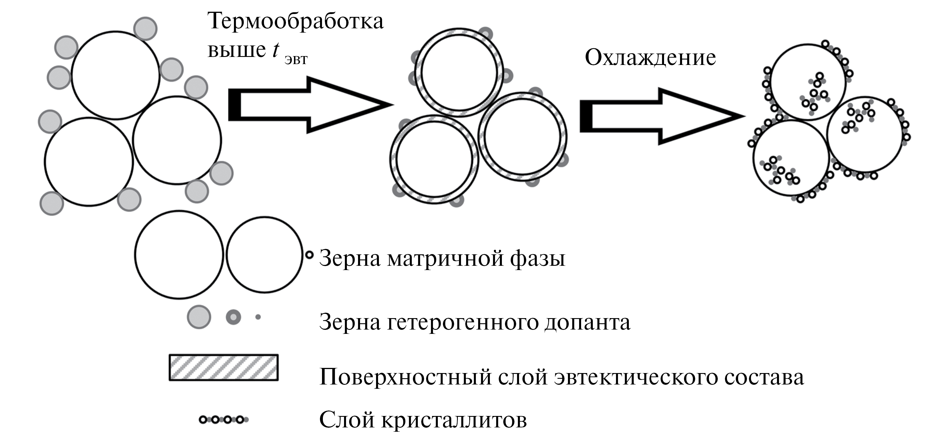 Рис. 9. Схема микроструктурных особенностей композитов в системах с образованием кристаллических разупорядоченных фаз при кристаллизации эвтектики с размером зерен субмикронного размера