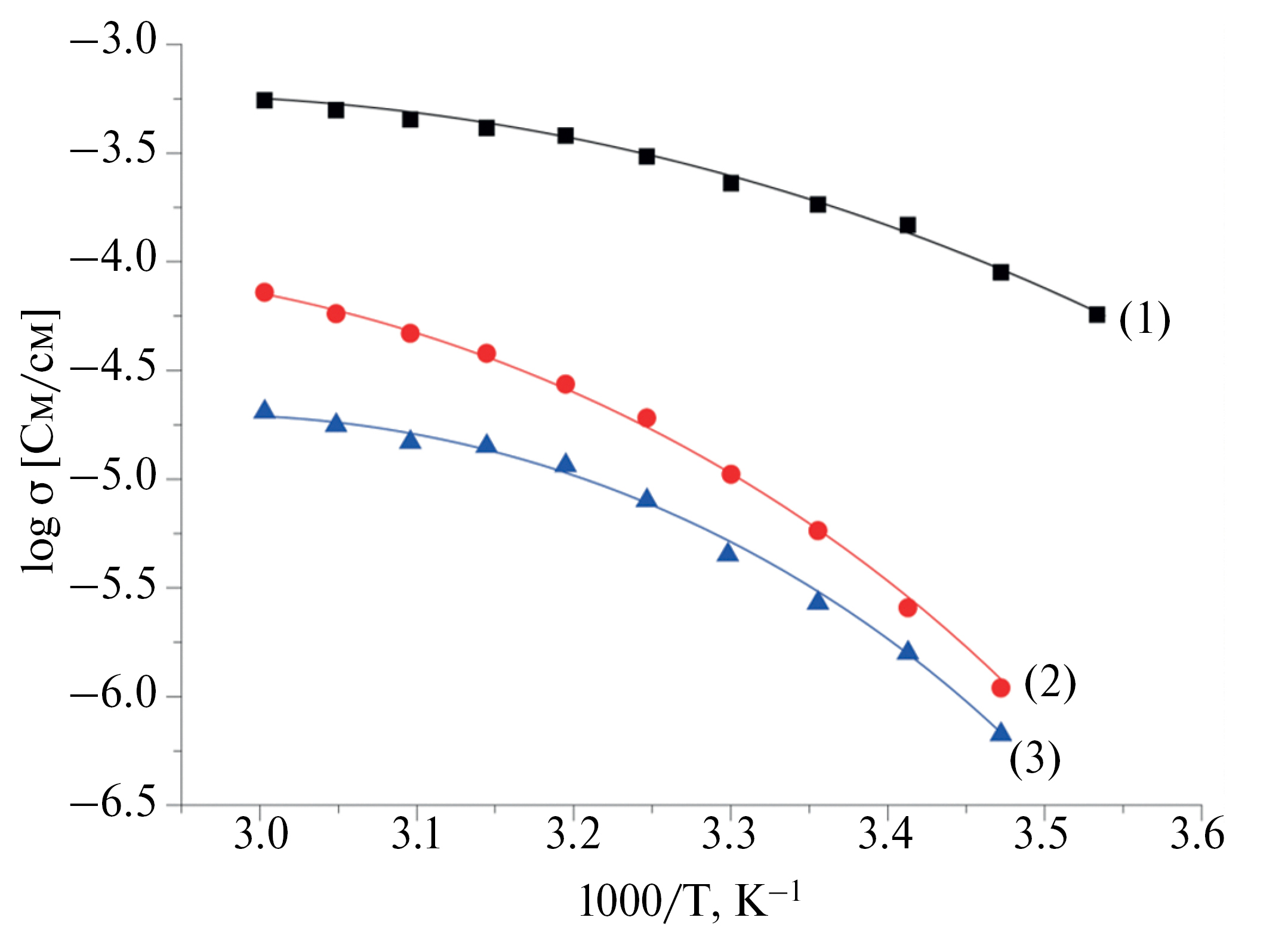 4. Fig. 3. Temperature dependences of ionic conductivity of Nafion-0 (1), Nafion-3.8 (2), Nafion-6.7 (3) membranes
