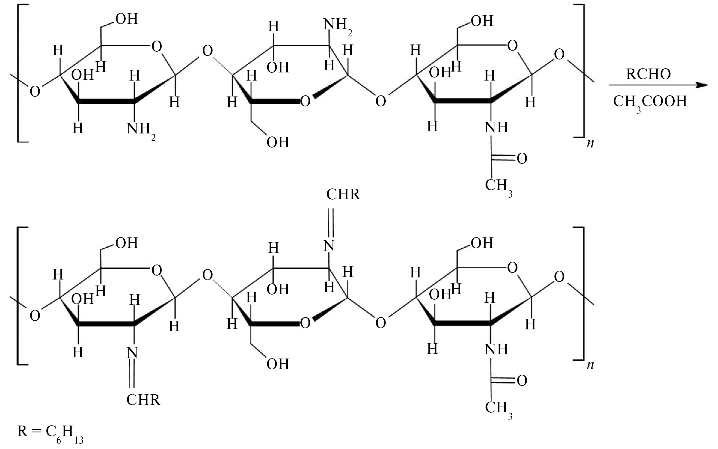 Для совмещения молекул крахмала и хитозана проводилась их предварительная модификация, т.к. крахмал растворяется в щелочных растворах, а хитозан – в кислотных. Молекула хитозана содержит больше химически доступных групп, чем крахмал, т.к. аминогруппа хитозана более химически активна, чем гидроксильная группа крахмала. Из литературных данных известно, что наличие аминогруппы в структуре повторяющегося звена полимера приводит к повышению барьерных свойств [28]. В связи с этим крахмал модифицировали привитой полимеризацией с акриламидом в массовом соотношении 1:2 в щелочной среде при температуре 60°C. В качестве инициатора привитой сополимеризации использовали персульфат аммония. В результате обеспечивалась растворимость сополимера КР–АА в диапазоне pH от 2 до 12. Схема получения сополимера КР–АА представлена на рис. 1. Хитозан был модифицирован энантовым альдегидом с образованием оснований Шиффа. Принципиальным является введение алкильных заместителей в структуру звеньев глюкозамина, которые могут оказывать пластифицирующий эффект. Схема реакции нуклеофильного присоединения к аминогруппе хитозана энантового альдегида представлена на рис. 2.