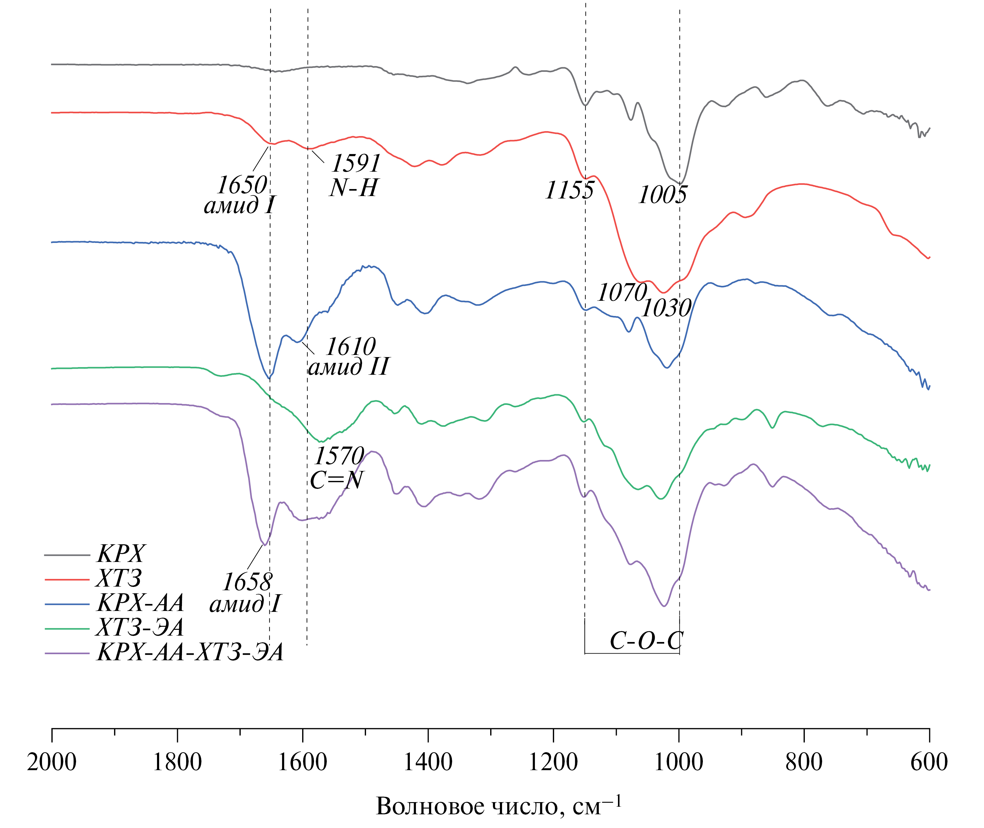 Рис. 3. ИК-спектры образцов крахмала (КРХ), хитозана (ХТЗ), хитозана-энантового альдегида (ХТЗ-ЭА), крахмала-акриламида (КРХ-АА), совмещенных сополимеров (КРХ-АА-ХТЗ-ЭА)