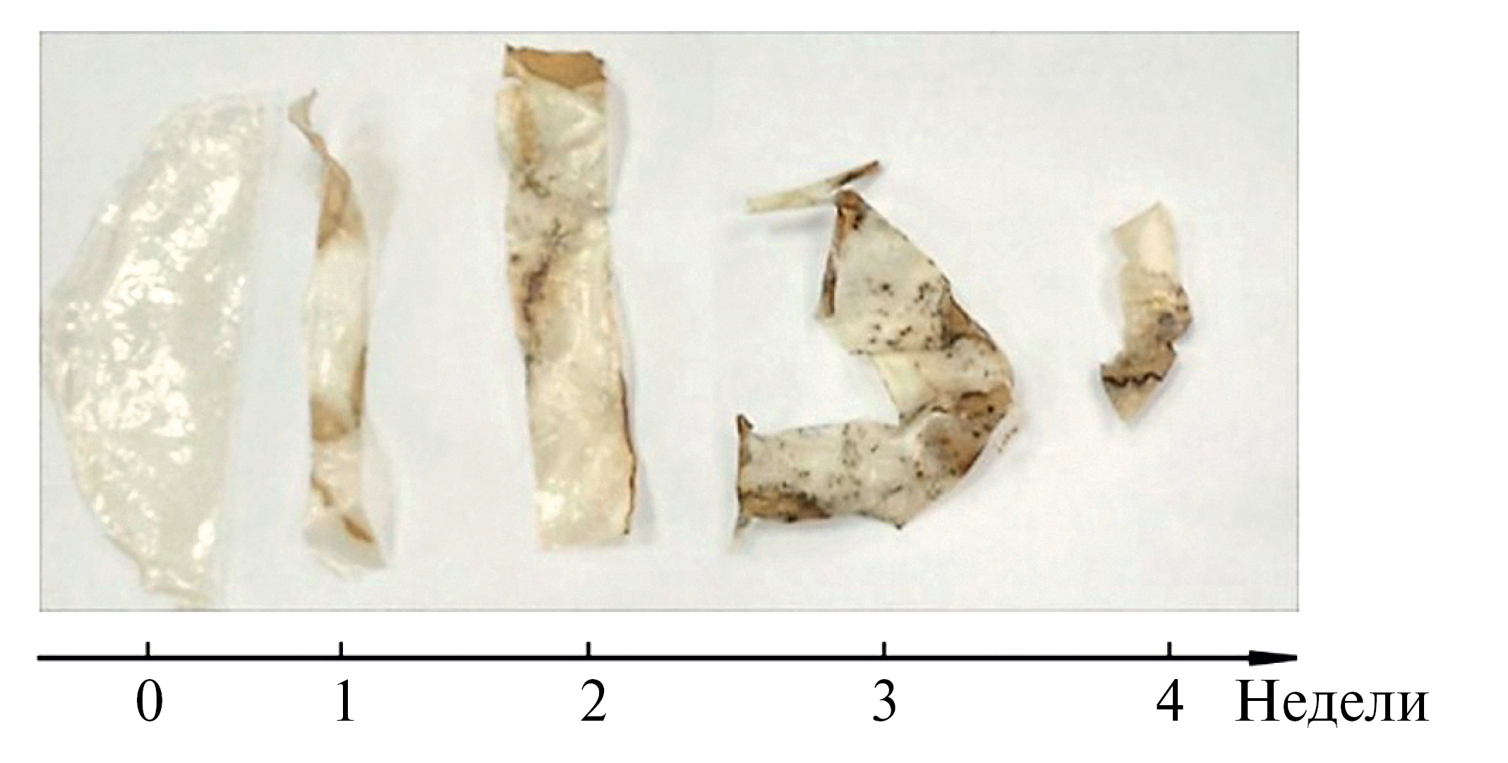 Следующим этапом данного исследования было определение биоразлагаемости синтезированных пленок. Биоразложение изучалось в течение 28 дней путем инкубации на поверхности мембраны микромицета Aspergillus niger с анализом продуктов разложения методом хромато–масс–спектрометрии. По результатам анализа продуктов разложения с помощью хромато–масс–спектрометрии после третьей недели инкубации в спектрах перестают обнаруживаться продукты разложения крахмала и хитозана. После четвертой недели на спектрах не обнаруживается акриламид, что свидетельствует о полном биоразложении мембран. После 4 недель оставшийся образец представляет из себя продукты метаболизма грибов. На рис. 5 показано изменение внешнего вида образцов при биодеструкции. В совокупности с барьерными свойствами пленки на основе модифицированных крахмала и хитозана являются перспективными для применения как в качестве вакуумной упаковки, так в качестве упаковки с газомодифицированной средой.