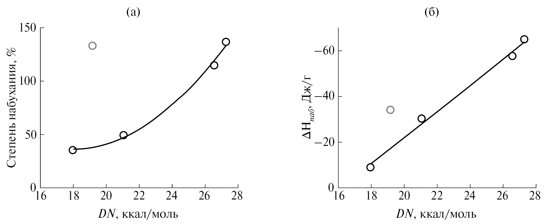 Наилучшая корреляция наблюдается со значениями донорного числа растворителей (за исключением этанола), как это видно на рис. 1. С ростом донорного числа растворителя (кроме этанола) закономерно увеличивается его поглощение мембраной (рис. 1 (а)), а также абсолютное значение энтальпии набухания (рис. 1 (б)).
