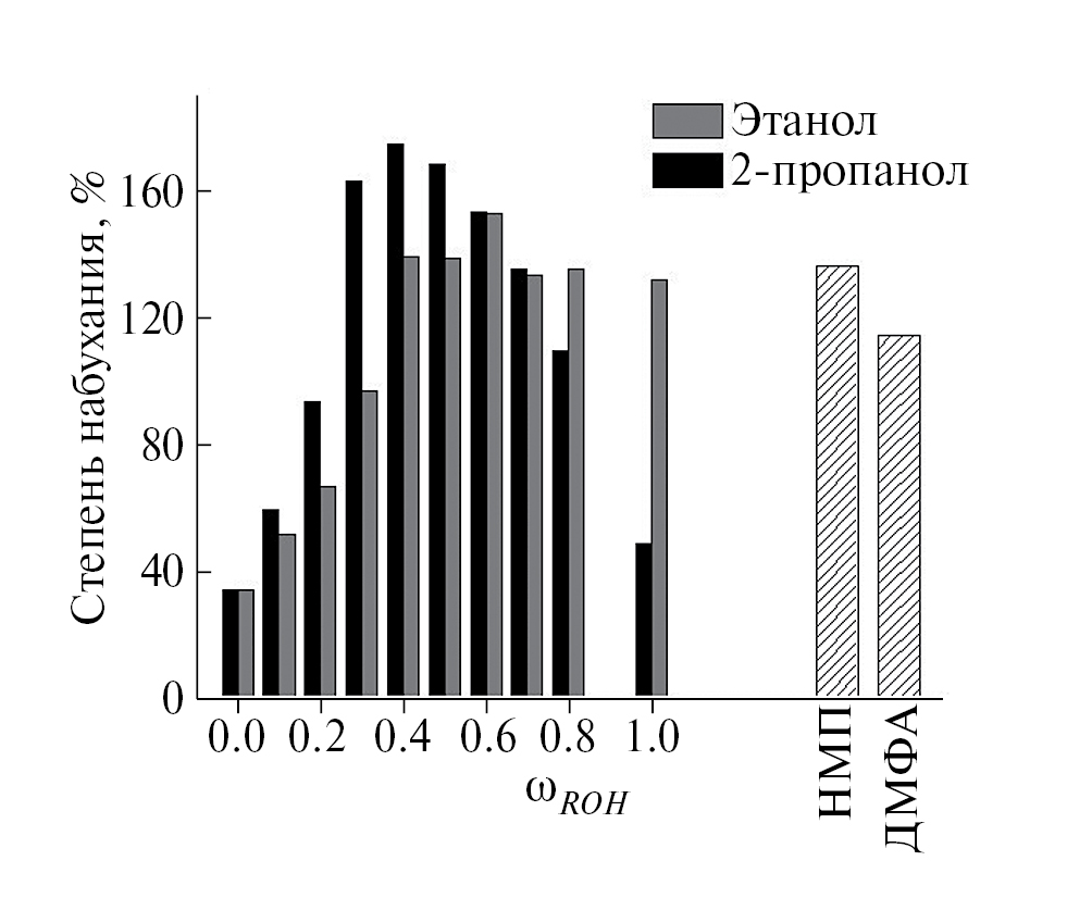 На рис. 2 представлена зависимость равновесной степени набухания мембраны Li-Nafion от массовой доли этанола и 2-пропанола в водном растворе. Там же для сравнения приведены значения степени набухания в НМП и ДМФА. Видно, что мембрана Li-Nafion набухает в водно-спиртовых растворах лучше, чем в индивидуальных растворителях. Вид зависимости степени набухания Li-Nafion в водном растворе этанола характеризуется увеличением поглощения вплоть до ωROH = 0.6. При дальнейшем увеличении концентрации этанола степень набухания образцов практически не изменяется. В данном диапазоне ωROH концентрационная зависимость для раствора 2-пропанола характеризуется максимумом поглощения мембраной при ωROH = 0.4. Дальнейшее увеличение концентрации 2-пропанола в водном растворе приводит к снижению степени набухания Li-Nafion, в отличие от раствора этанола в воде.