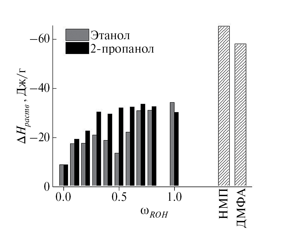 Зависимость энтальпии набухания полностью высушенного Li-Nafion от массовой концентрации рассмотренных спиртов в их водных растворах представлена на рис. 3, где также для сравнения приведены значения энтальпии набухания в НМП и ДМФА. Значения энтальпии набухания отрицательны во всем концентрационном диапазоне растворов спиртов. Тепловой эффект при набухании полимера в индивидуальных спиртах выше для этанола, что соотносится с бо́льшим значением степени набухания в сравнении с 2-пропанолом. Вид зависимости для 2-пропанола характеризуется ростом абсолютного значения энтальпии набухания при увеличении содержания 2-пропанола до его концентрации в растворе ωROH = 0.3–0.5 при которой степень набухания мембраны принимает максимальные значения. При дальнейшем увеличении концентрации 2-пропанола энтальпия набухания Li-Nafion не изменяется в пределах экспериментальной погрешности и находится на уровне энтальпии набухания в индивидуальном 2-пропаноле.