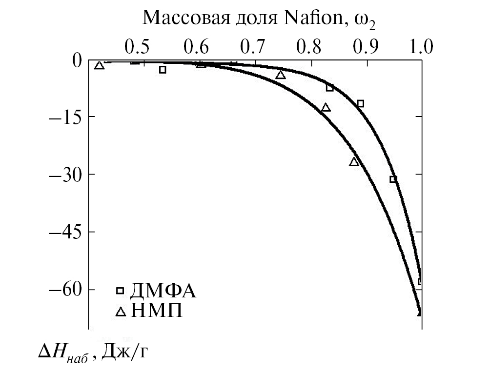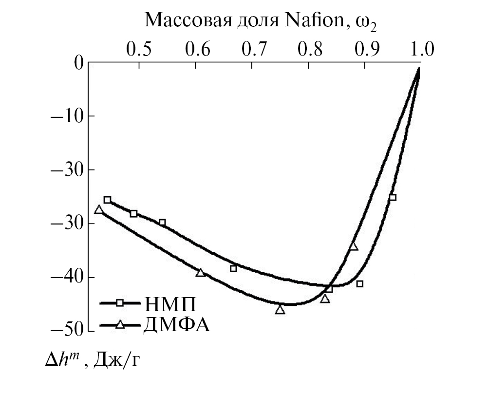 Полученные зависимости представлены на рис. 5. Значения энтальпии смешения для рассмотренных растворителей принимают отрицательные значения во всем концентрационном диапазоне. Это говорит об энергетическом выигрыше при взаимодействии ДМФА и НМП во всем диапазоне степени набухания мембраны Li-Nafion. Вид зависимостей имеет куполообразный форму с максимумом в области концентраций полимера 70–80 мас. %.
