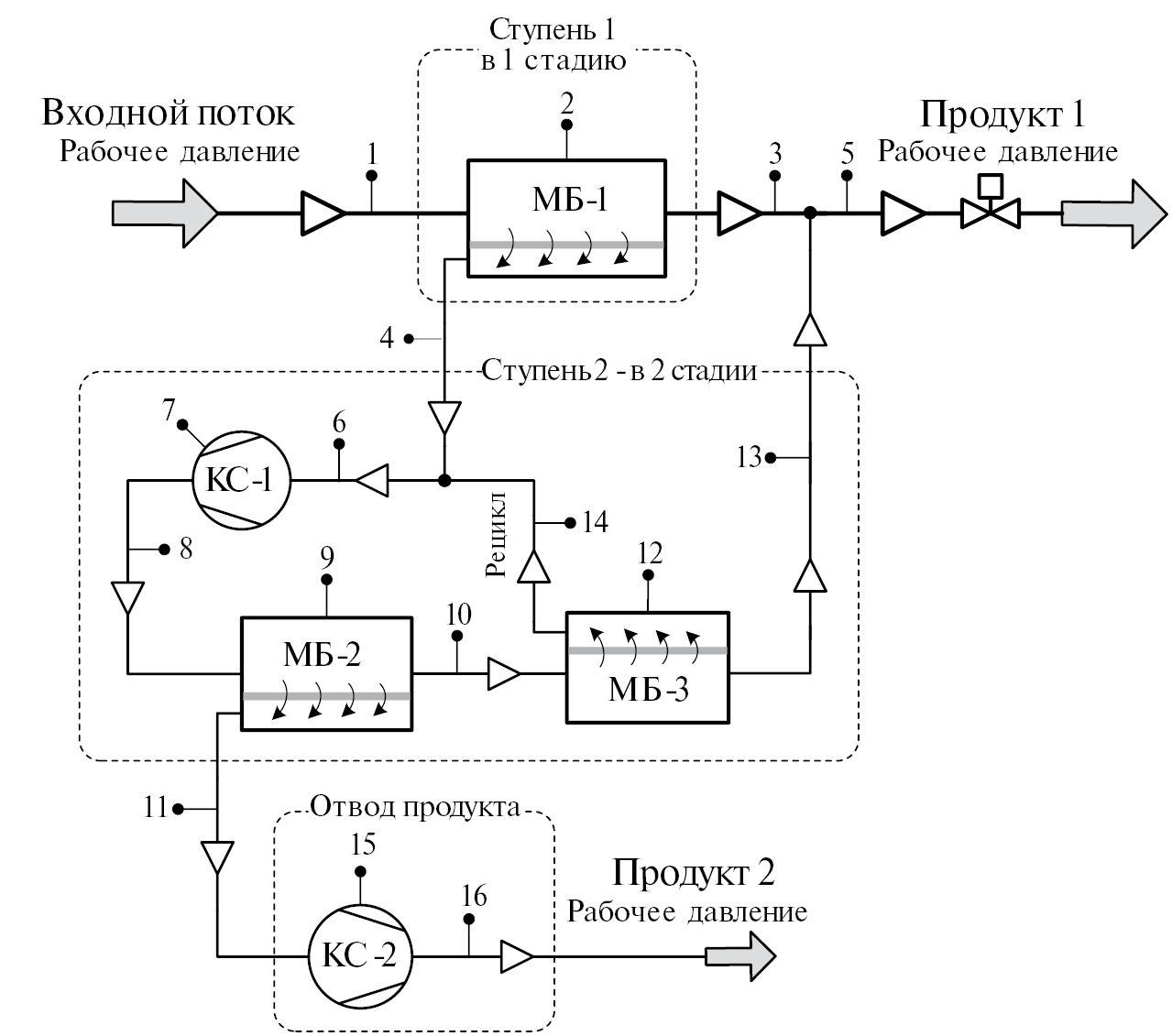Рис. 1. Принципиальная двухступенчатая схема мембранного извлечения гелия и его концентрирования в соответствии с российским патентом [8], где 1 – трубопровод для подачи ГПГ при рабочем давлении, удовлетворяющий ТУ СТО Газпром 089-2010 и, прошедший тщательную фильтрацию от механических примесей; 2 – одностадийный мембранный блок МБ-1 из параллельно работающих МЭ; 3 – трубопровод отвода ретентата от МБ-1 с малым остаточным содержанием гелия; 4 – трубопровод пермеата низкого давления от МБ-1 с извлеченными газами; 5 – трубопровод для отвода объединенных двух газовых потоков (3 и 13) при рабочем давлении (от первой и второй ступеней) и с малым остаточным содержанием гелия как один из конечных результатов мембранного газоразделения – Продукт 1; 6 – трубопровод подачи газа на вход КС-1, после объединения двух пермеатных потоков низкого давления от МБ-1 и от МБ-3 с целью их сжатия до рабочего давления; 7 – многоступенчатая компрессорная станция КС-1 со вспомогательным оборудованием; 8 – трубопровод отвода сжатого потока газа из КС-1 для последующего газоразделения; 9 – одностадийный мембранный блок МБ-2 для реализации первой стадии газоразделения на второй ступени мембранной установки; 10 – трубопровод отвода ретентата от МБ-2 и его подачи в МБ-3 для последующей стадии газоразделения в составе второй ступени; 11 – трубопровод отвода пермеата от МБ-2 для формирования Продукта 2, который можно условно назвать “гелиевым концентратом”; 12 – одностадийный мембранный блок МБ-3 для реализации финальной стадии газоразделения для достижения требуемых итоговых результатов от второй ступени; 13 – трубопровод отвода ретентата от МБ-3 с малым остаточным содержанием гелия с его концентрацией, как и в ретентате от МБ-1 для объединения этих двух потоков; 14 – трубопровод отвода циркулирующего пермеата низкого давления от МБ-3 для последующей подачи совместно с пермеатом от МБ-1 на вход КС-1; 15 – многоступенчатая компрессорная станция КС-2 с целью восстановления начального рабочего давления у пермеатного потока от МБ-2 для корректной оценки суммарной удельной энергоемкости всех процессов в двухступенчатой мембранной установке; 16 – трубопровод отвода гелиевого концентрата с рабочим давлением, как второго конечного продукта – Продукт 2 для принятия решения по его дальнейшему использованию.