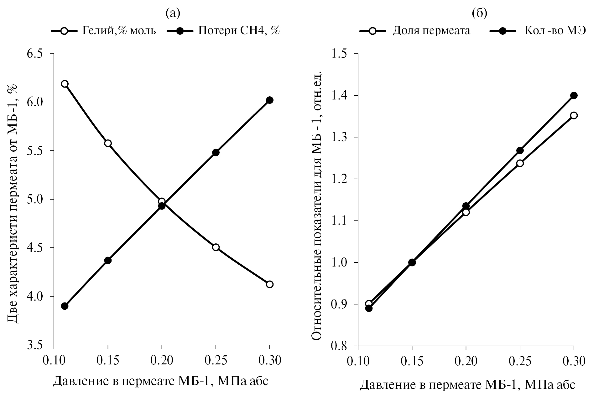 В приведенном анализе использовалось рабочее давление в 10.0 МПа абс., а в области пермеата 0.15 МПа абс. Требуется учитывать не разницу в этих давлениях, а особо обратить внимание на соотношение этих давлений. При заданной степени извлечения гелия в МБ-1 на уровне 90% и фиксированном давлении в над-мембранном пространстве на уровне 10.0 МПа абс. будем менять давление в пермеате МБ-1 в диапазоне 0.11÷0.30 МПа абс. Результаты численного анализа при таких изменениях показаны на рис. 3.