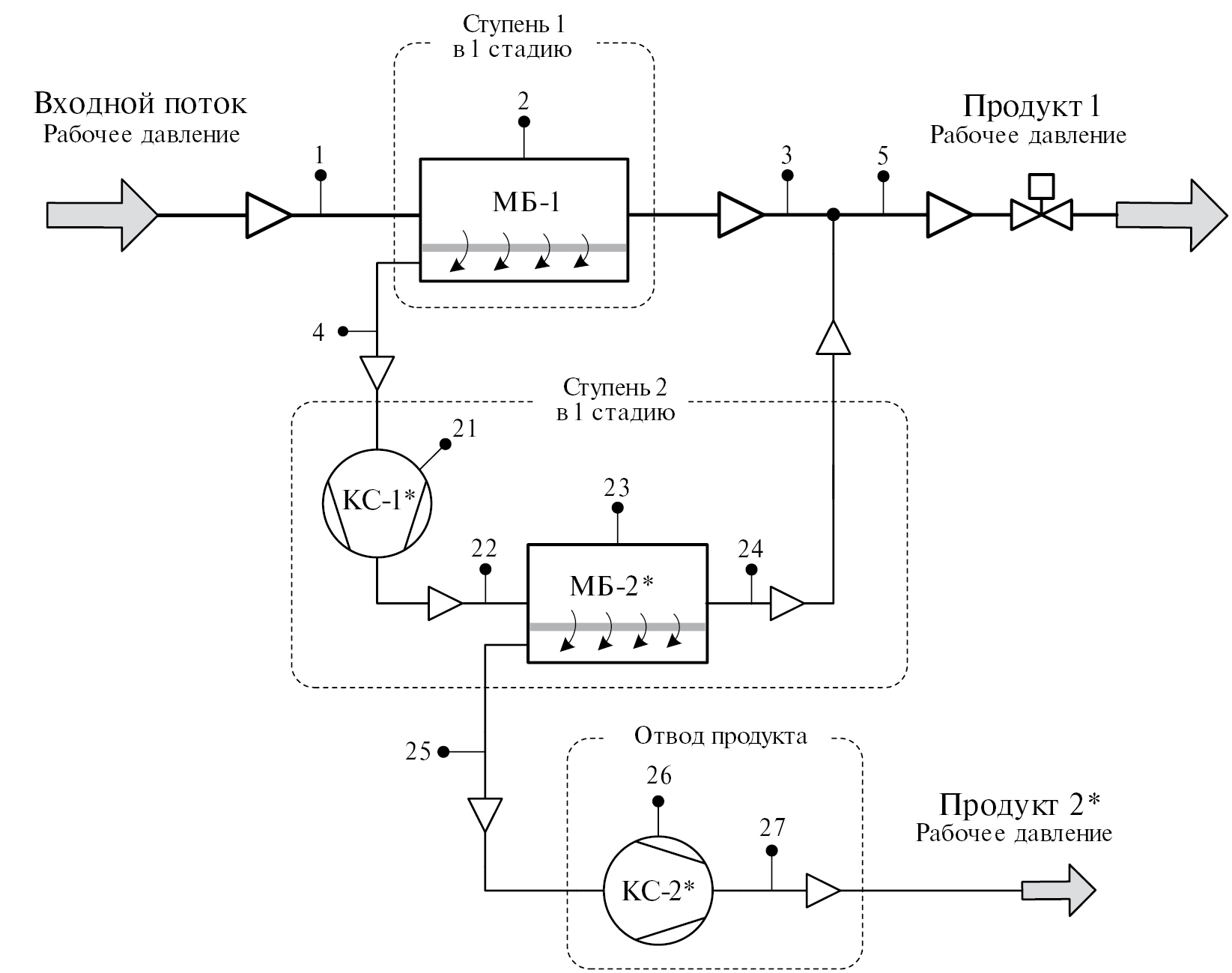 Для двухступенчатых мембранных установок характерно следующее: