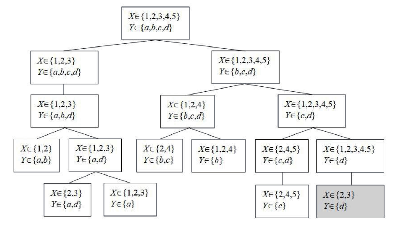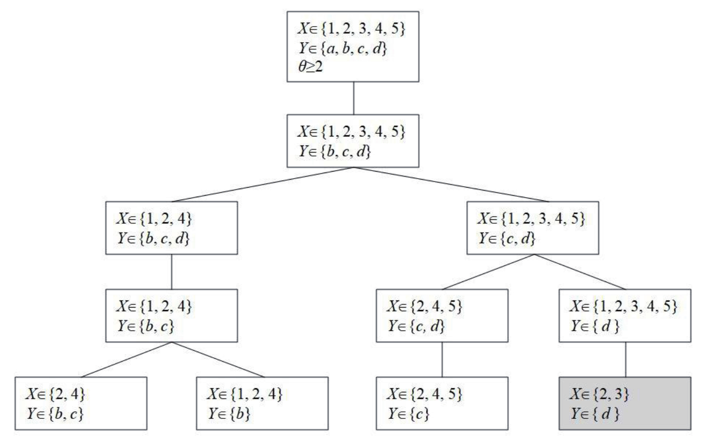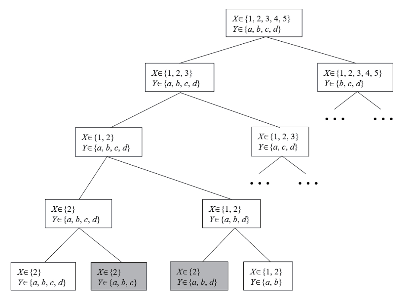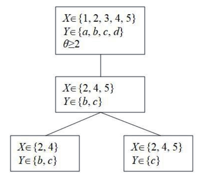Разработанный метод нахождения замкнутых паттернов включает систематическое исследование пространства поиска и построение дерева поиска следующим образом. Каждый уровень дерева поиска отображается в одну из строк сжатой таблицы D-типа, а узел отображается в определённую компоненту этой строки. Каждое решение задачи удовлетворения ограничений формируется путём выбора одной компоненты из каждой строки сжатой таблицы D-типа. Фрагмент дерева поиска для примера 1, построенного на основе сжатой таблицы K[XY], показан на рисунке 1.