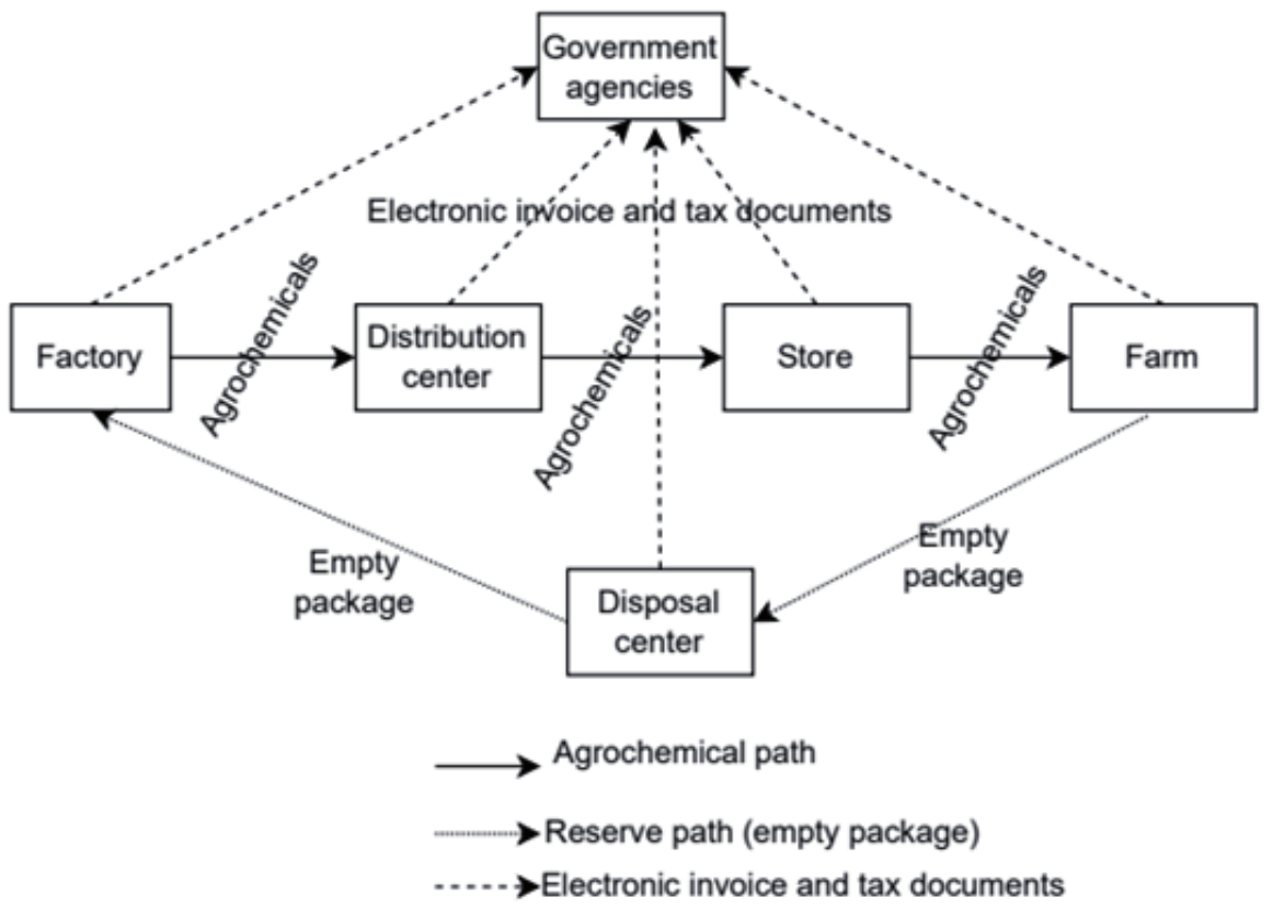 The activities carried out within a farm can be summarized as: the farmer buys the product (agrochemicals) and takes it to the farm on which he will perform the application on the cropland. After using the product, empty packages are sent to an official disposal center. The disposal center receives empty packaging, temporarily stores it, and then forwards it to a factory for the correct disposal. The transit of empty products and packaging between the actors of the chain is always done with documents such as the electronic invoice; the exception is the act of purchase by the farmer who adds an agronomic recipe. In this scenario, public agencies also participate in receiving product transit data via electronic invoice. Each actor in this scenario is running a node of an blockchain and has its own ERP (Enterprise Resource Planning).